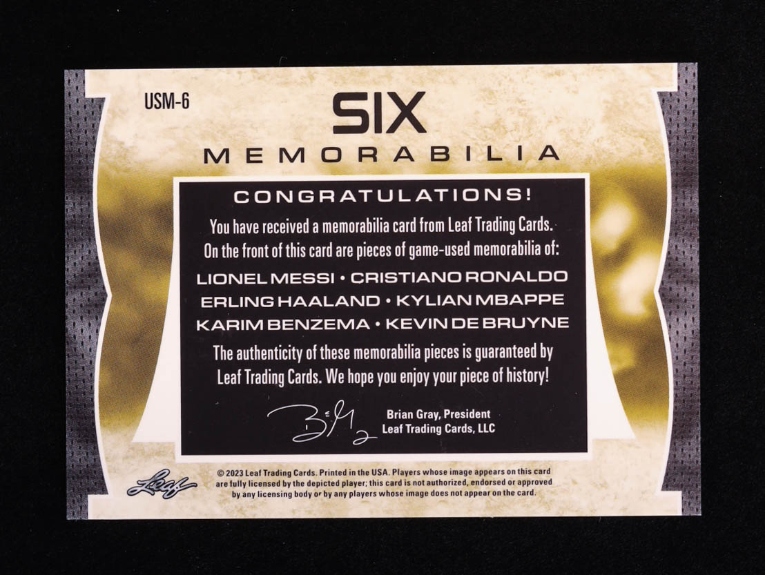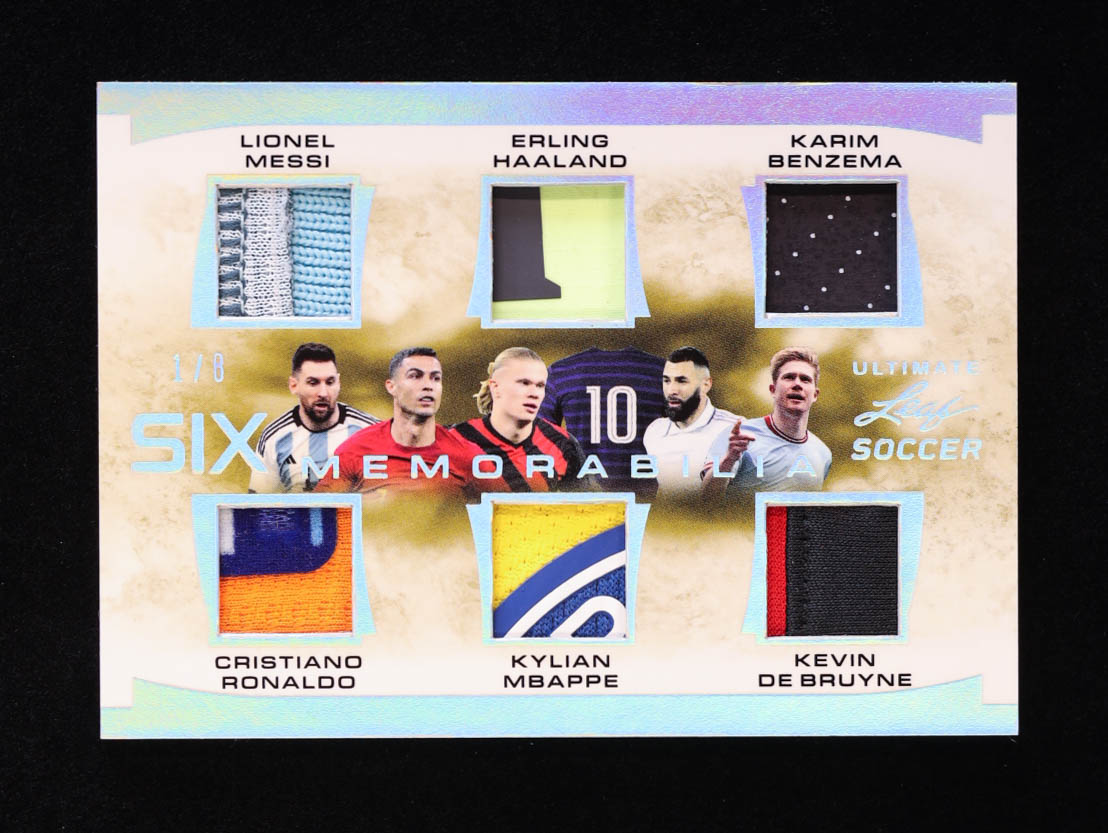 Lionel Messi / Erling Haaland / Karim Benzema / Cristiano Ronaldo / Kylian Mbappe / Kevin De Bruyne 2023 Leaf Ultimate Six Memorabilia Platinum #USM6 #1/8