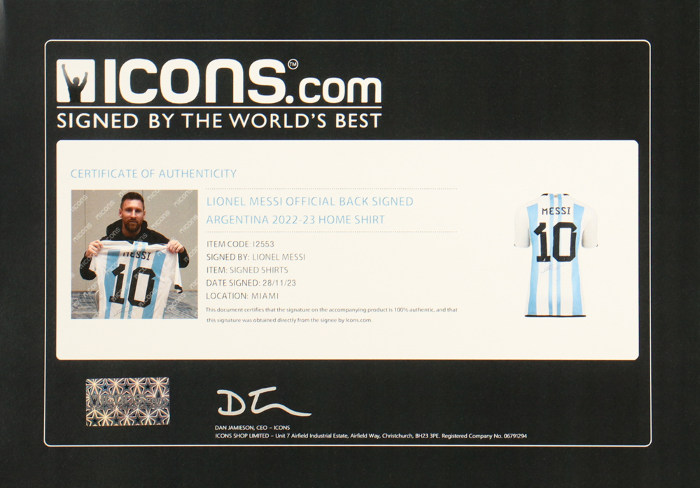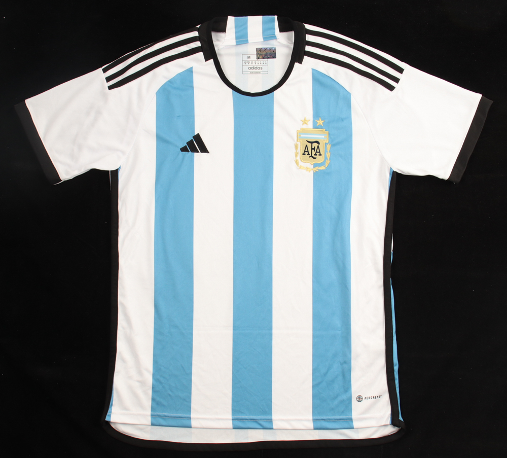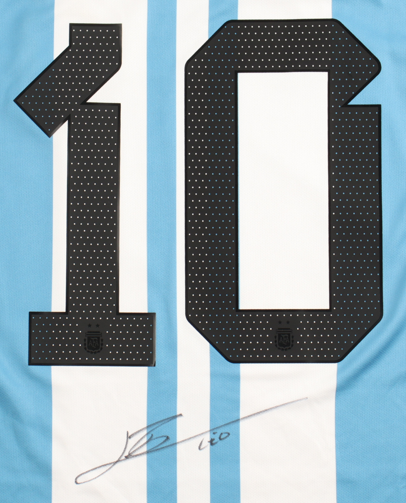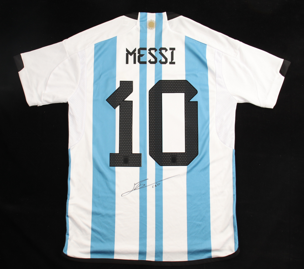 Adidas jersey with everything printed on, size L. Hand-signed and inscribed by Lionel Messi (Team Argentina).