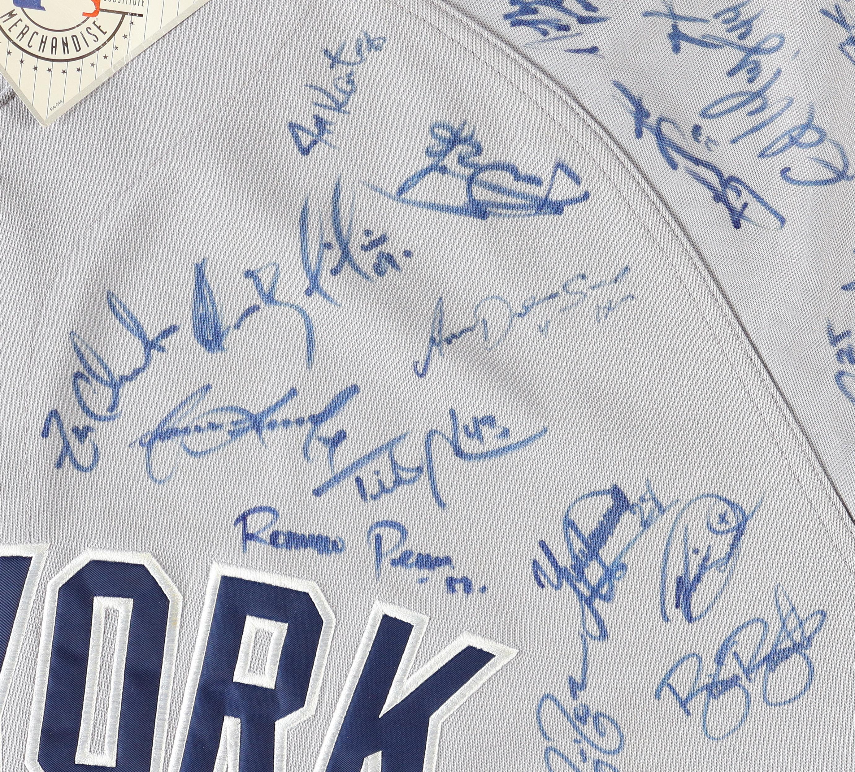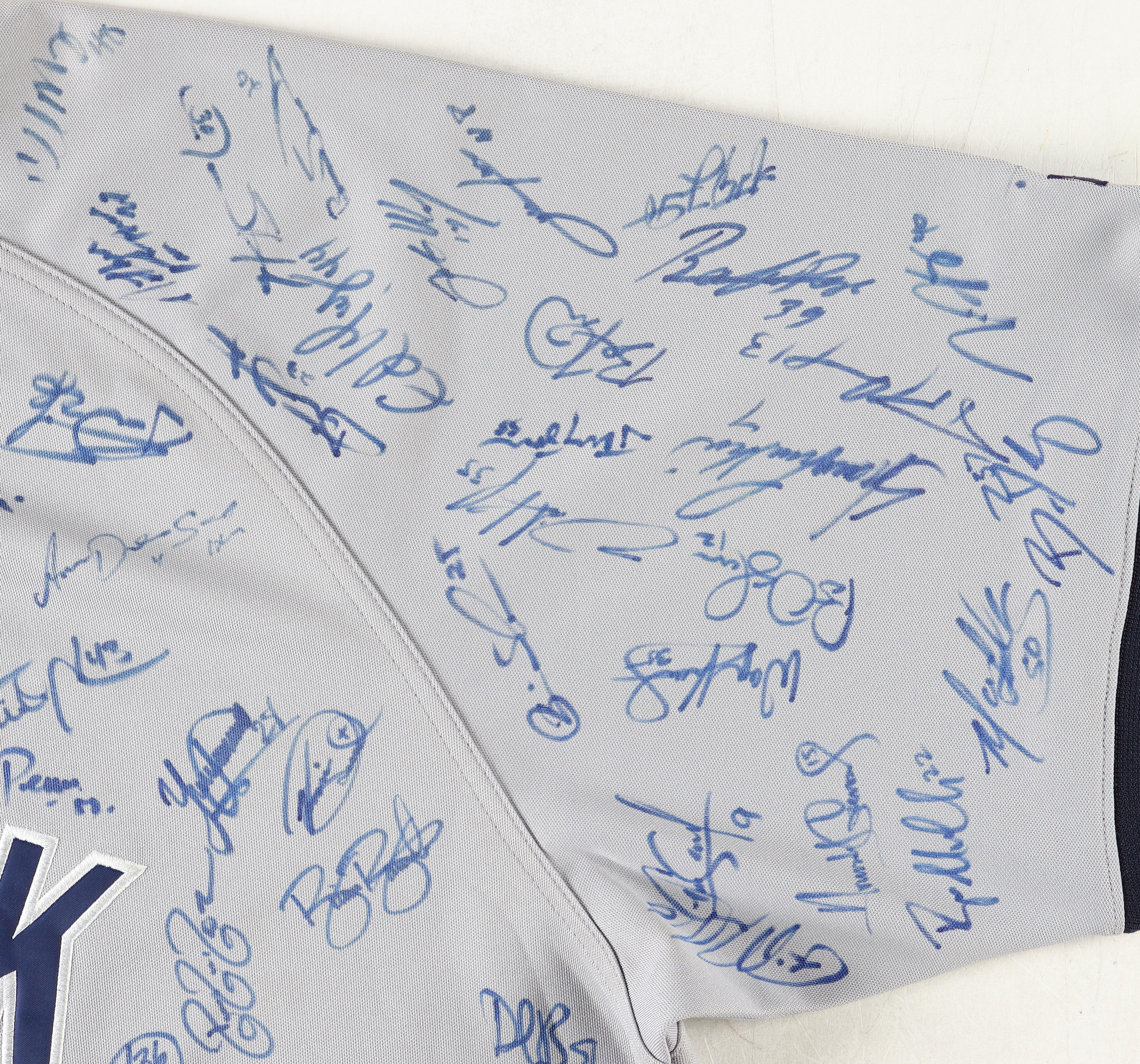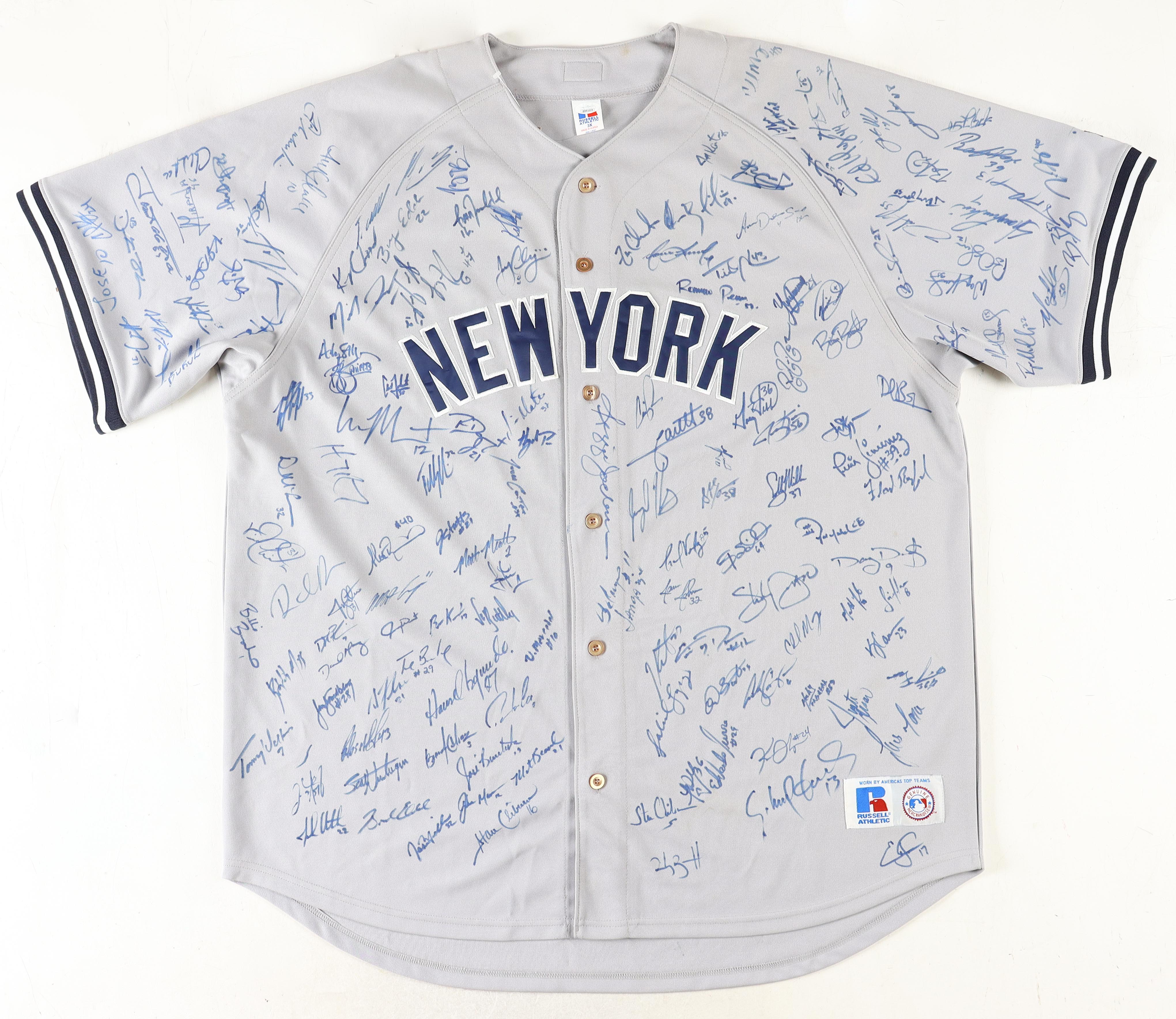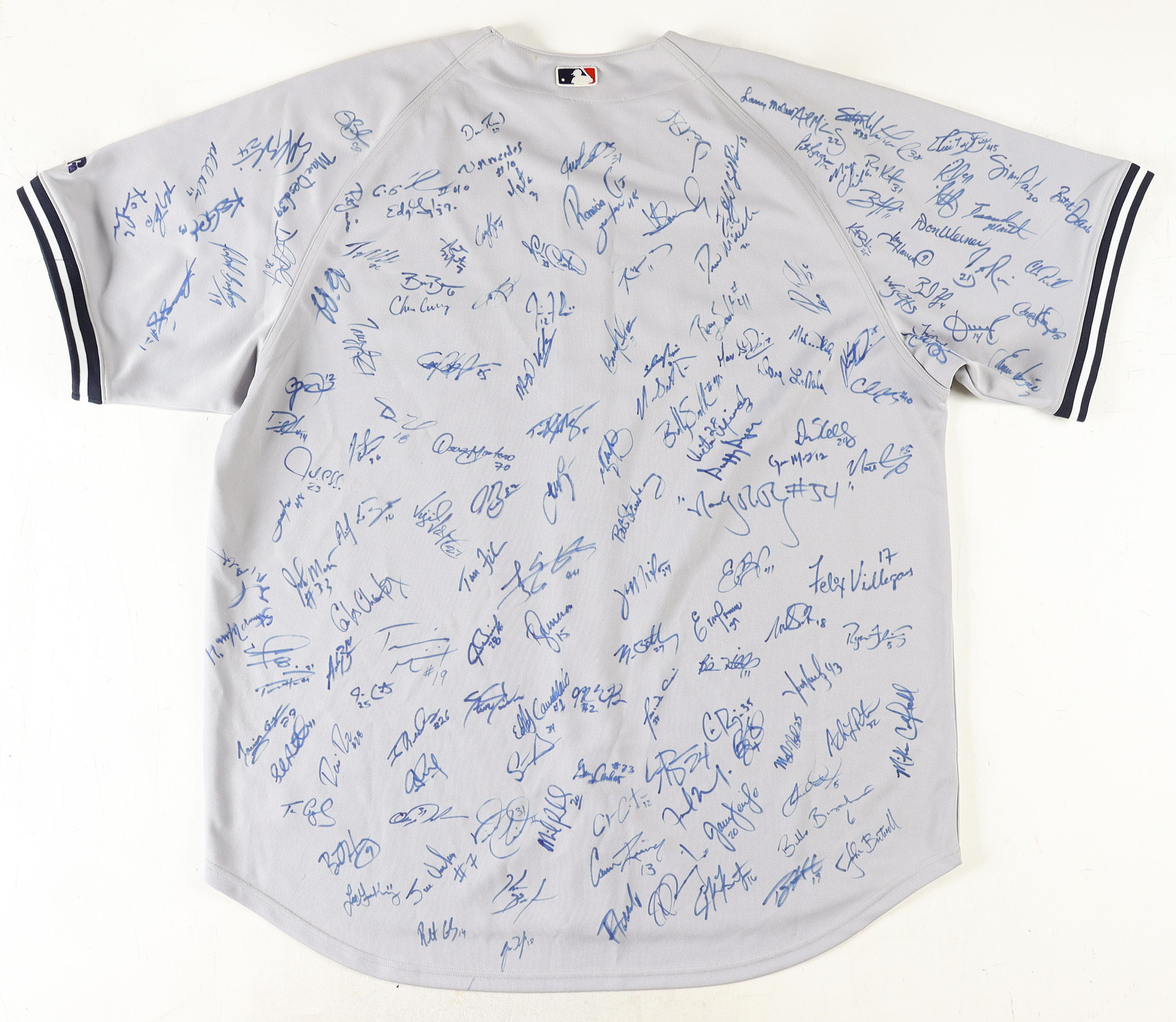 Russell New York Yankees jersey with everything sewn on, size 3XL, has been hand-signed by (100+) including Reggie Jackson (HOF), Justin Verlander, Andrew McCutchen, and Miguel Cabrera! This jerrsey features players from all different teams in the MLB!