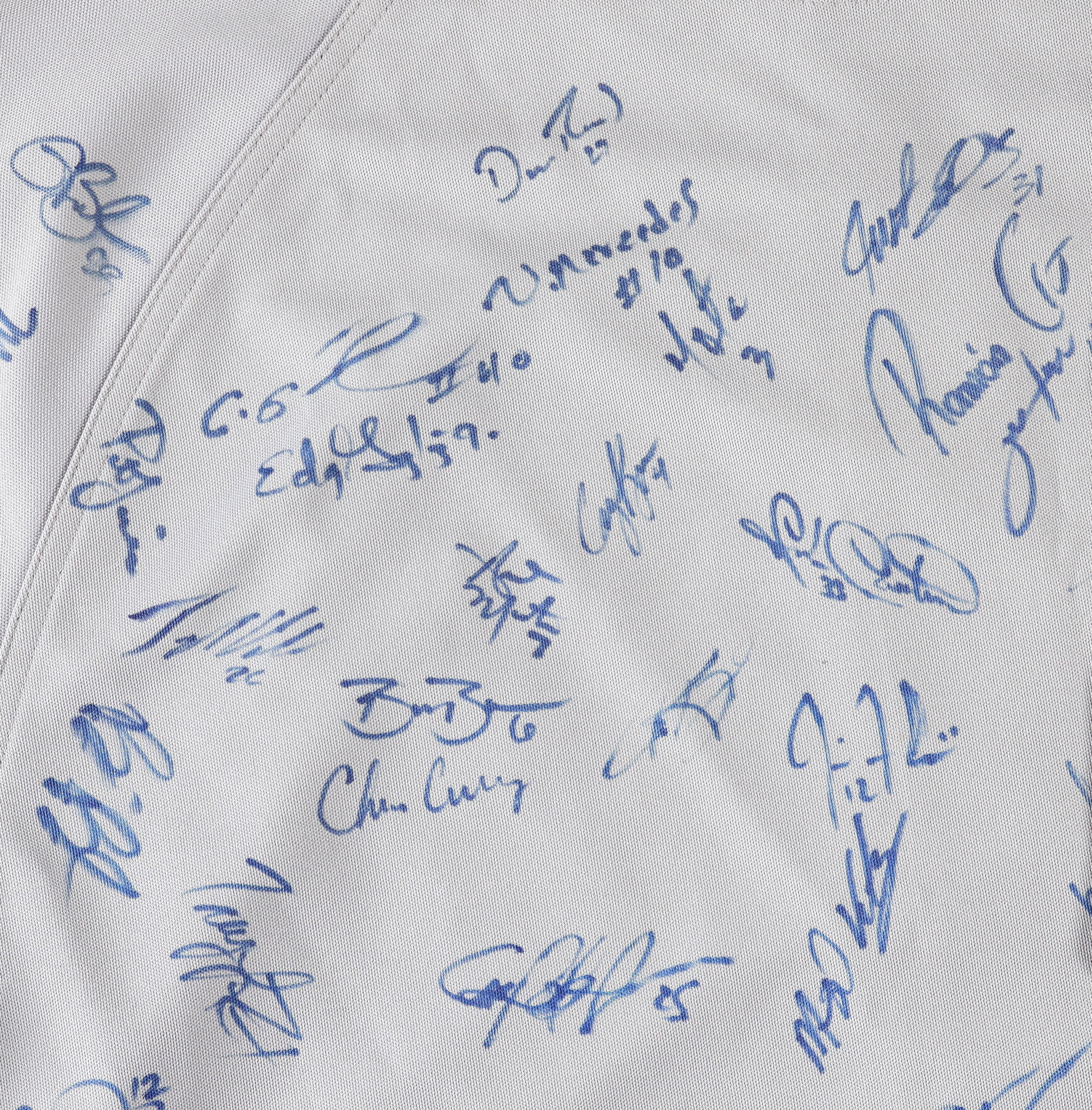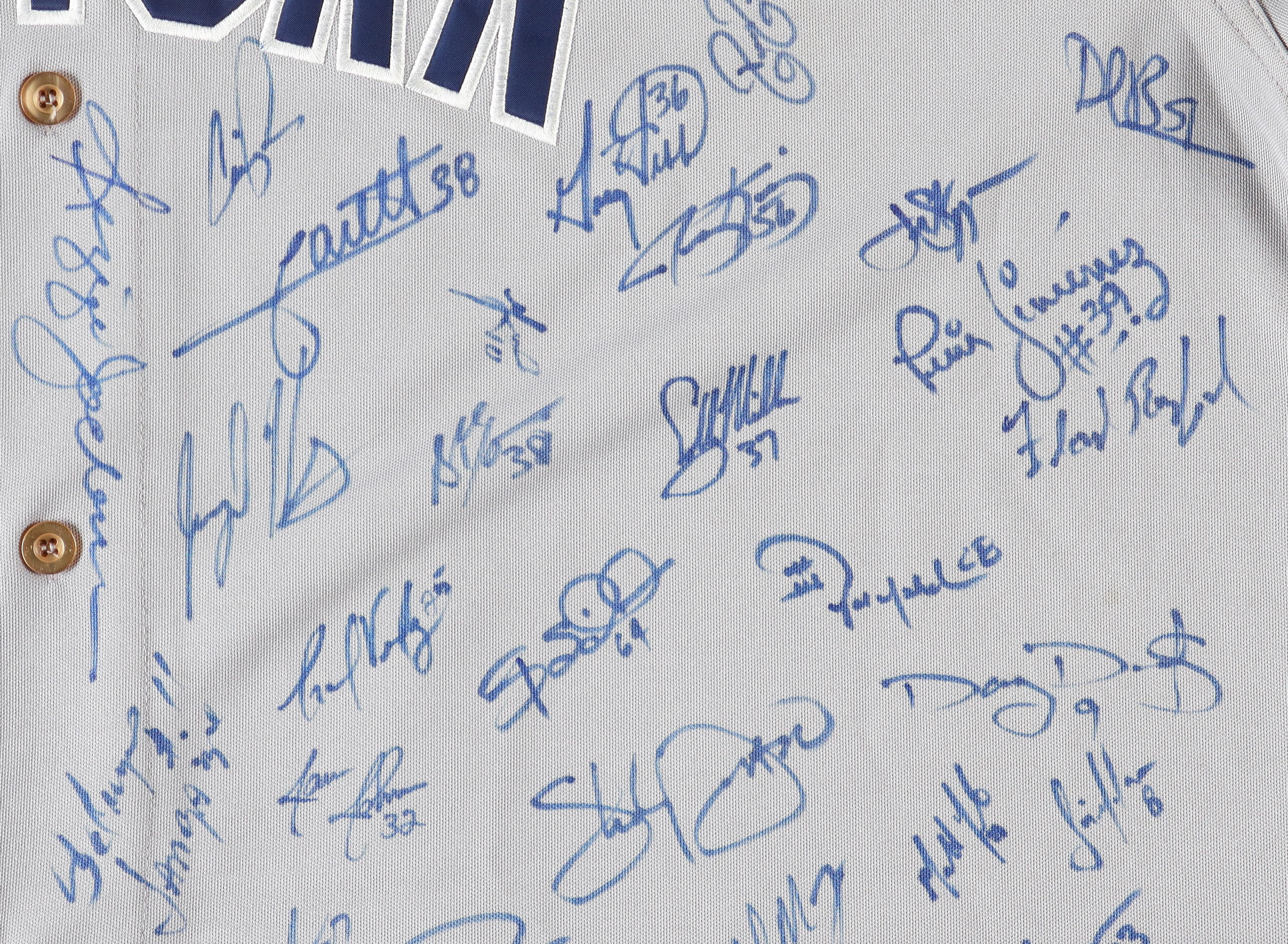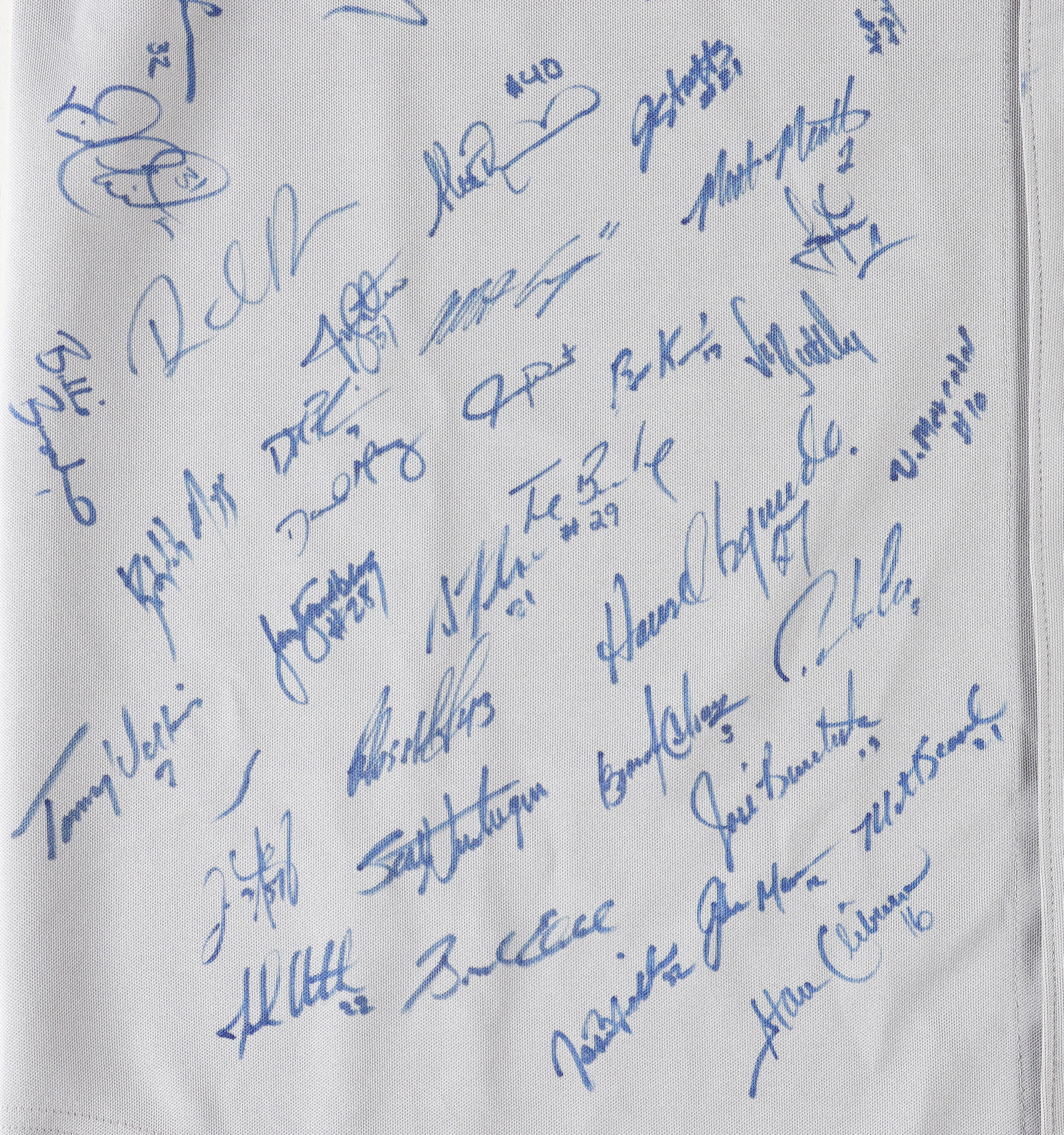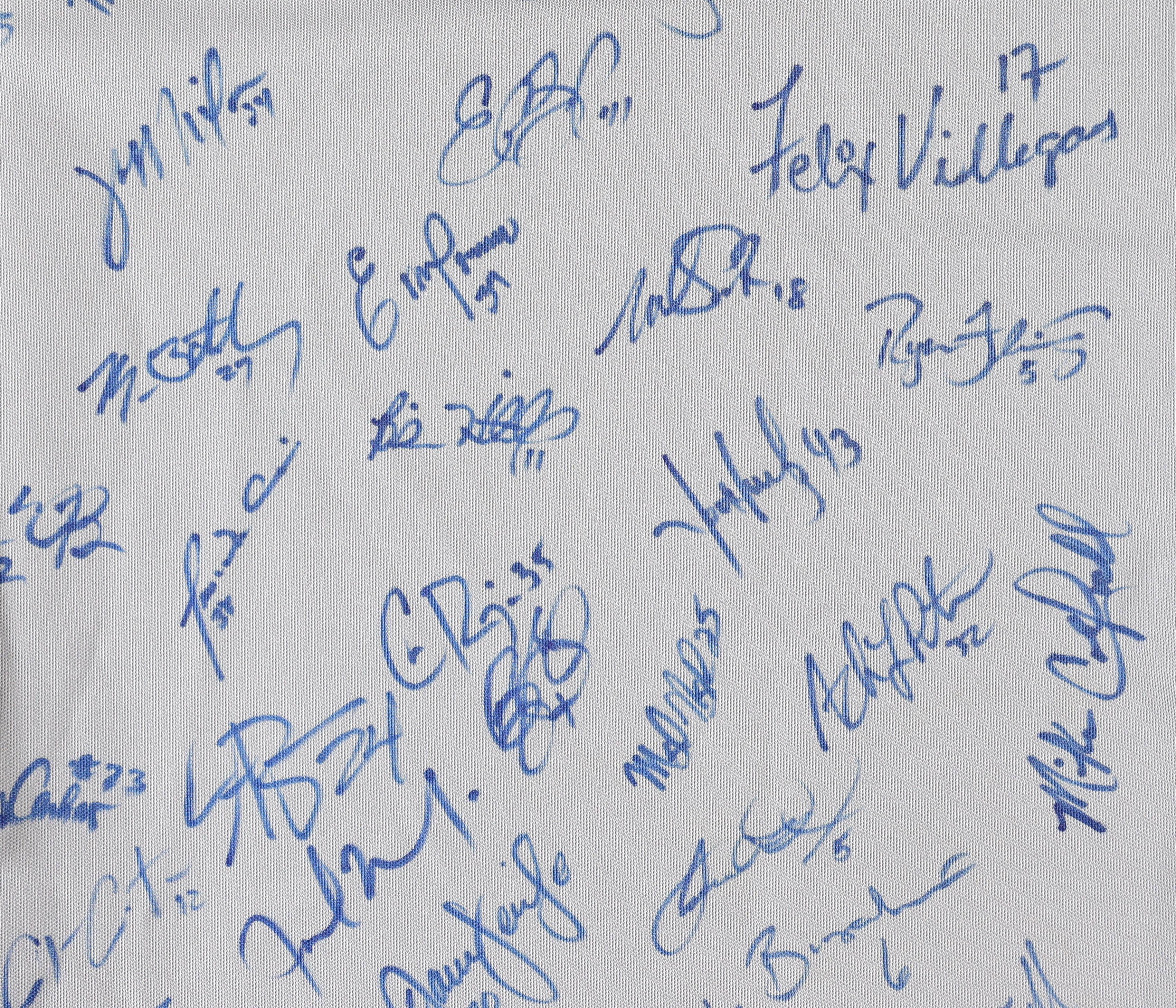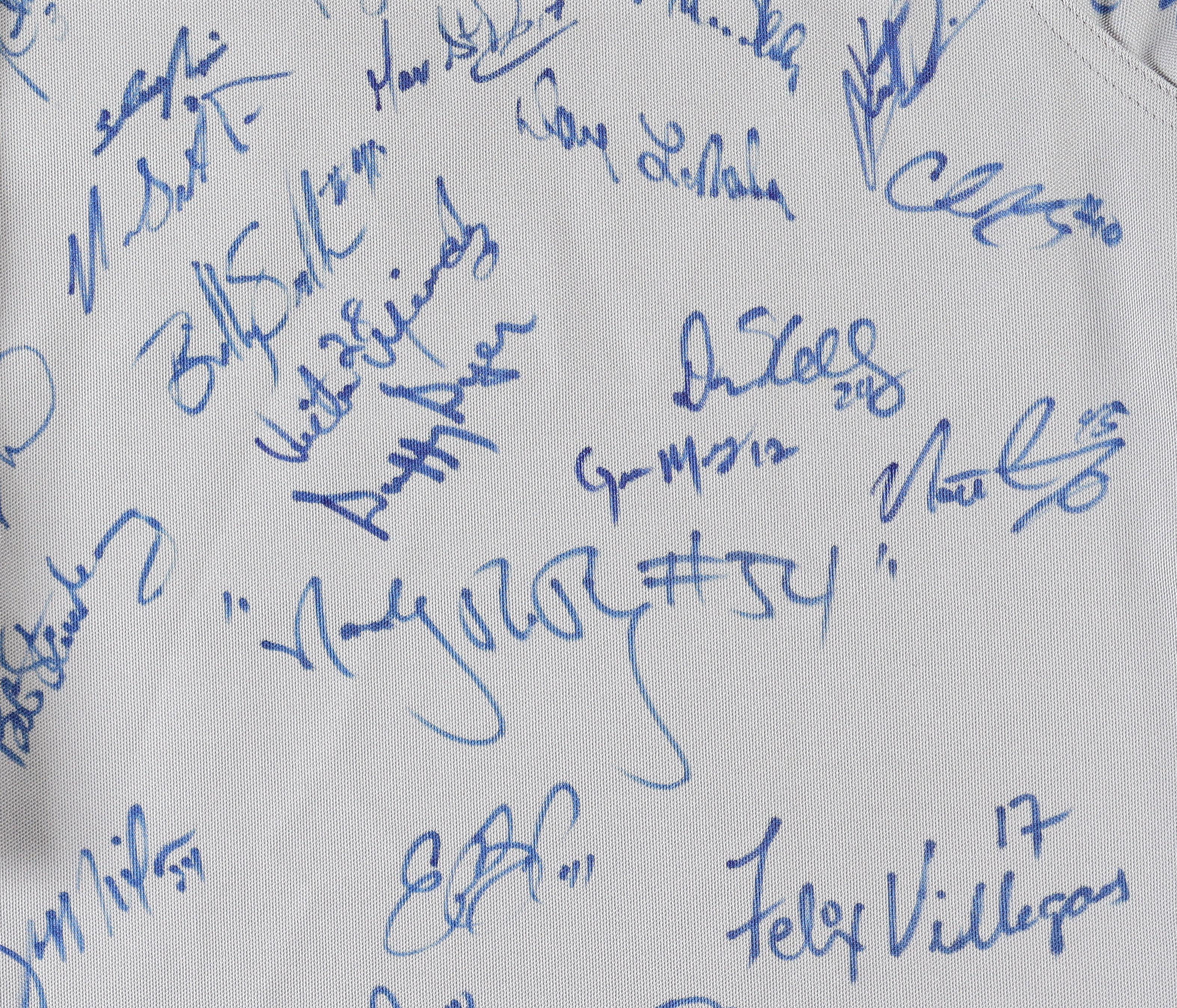 Other notable signers on the jersey include Dustin Pedroia, Jon Lester, Hanley Ramirez, Joba Chamberlain, Jose Miranda, Danny Werner, Anibal Sanchez, Phil Hughes, Manny Delcarmen, Ramon Pena, Danny Werner, Miguel Cabrera, Jose Batista, Doug Dyer, Ryan Cameron, Bob Stanley, Jose Tabata, Austin Romine, Pat Neshek, and Brian Bannister!