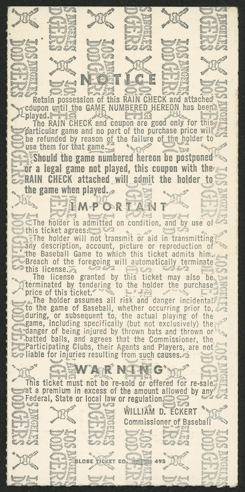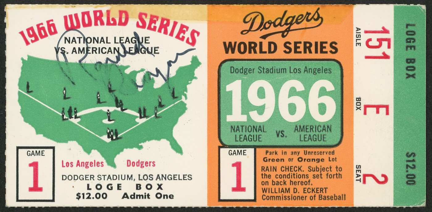 Ticket from 1966 World Series between the National League vs. American League. The ticket is hand-signed in black ink pen by Ronald Reagan (D. 2004).
