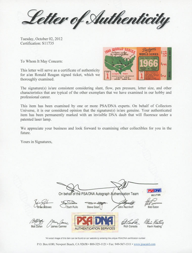 Ronald Reagan Signed Original 1966 World Series Ticket (PSA LOA)