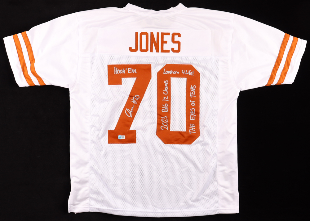 Custom jersey with everything sewn on, size XL. Hand-signed and inscribed by Christian Jones.