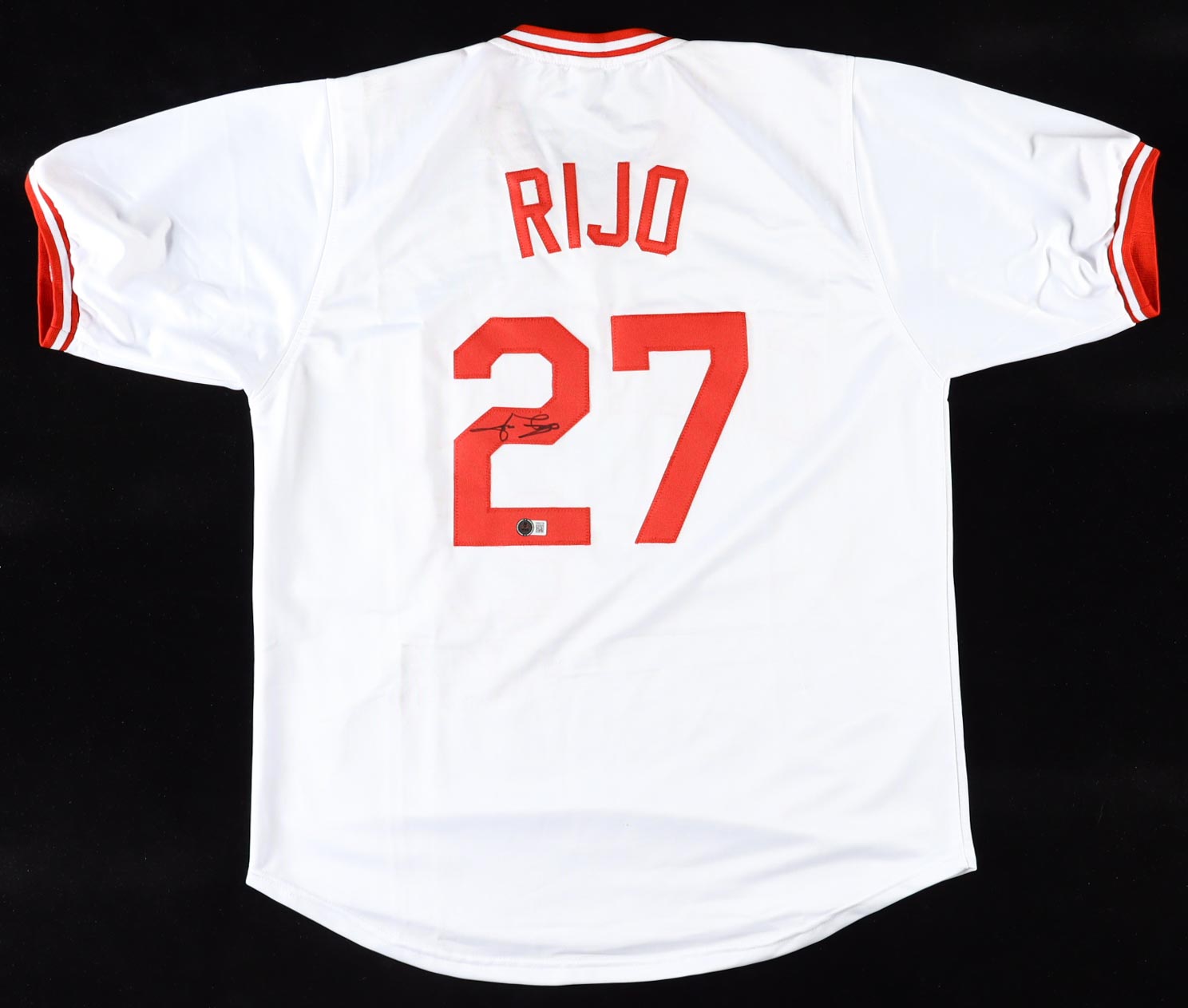 Custom jersey with everything sewn on, size XL. Hand-signed by Jose Rijo.