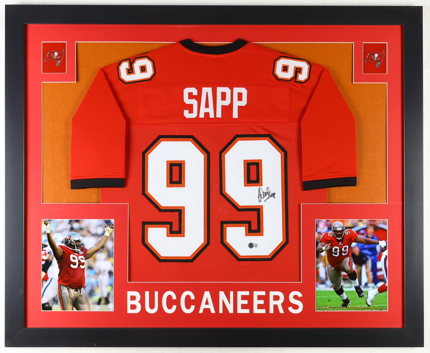 Custom frame measures approximately 35" x 43" in size and features a jersey hand-signed by Warren Sapp (HOF).