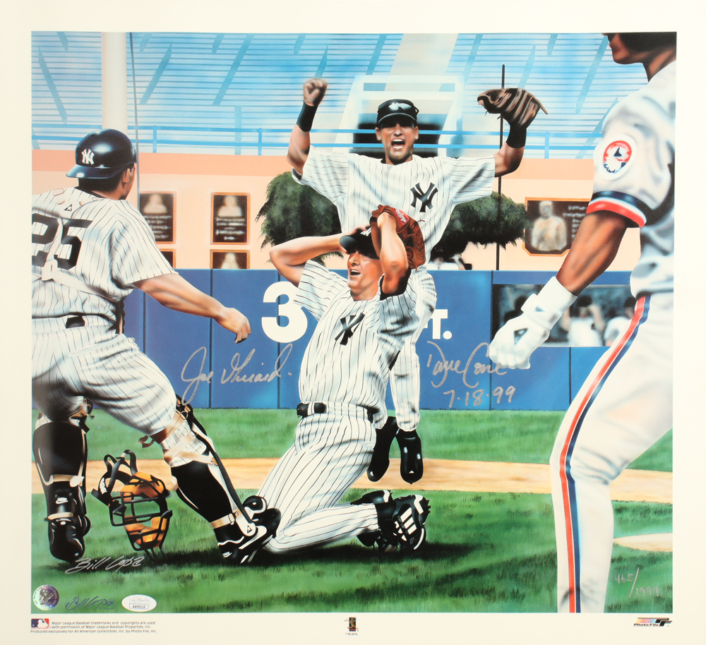 Print measures approximately 19.25" x 20.5" in size. The print is hand-signed and inscribed by David Cone (New York Yankees) and Joe Girardi (New York Yankees) as well as by the artist, William Lopa. The print is limited edition and is numbered #465/1999.