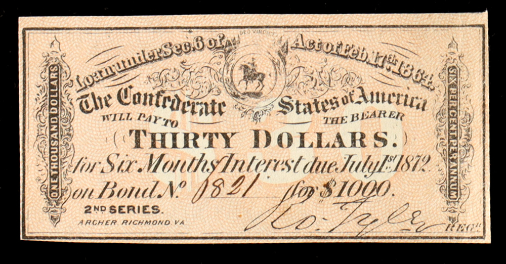 1864 $30 Thirty Dollars Confederate States of America Richmond CSA Bank Note Bond