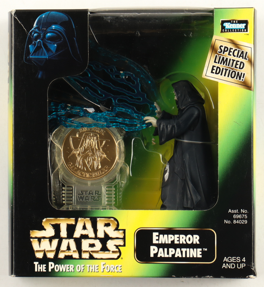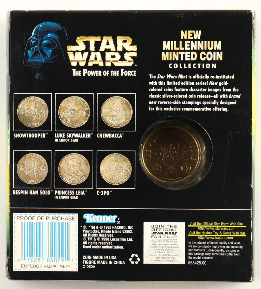 1998 Hasbro Star Wars "Emperor Palpatine" The Power of the Force action figure and collectable character coin. Please note, this item is unsigned and the box shows handling wear.