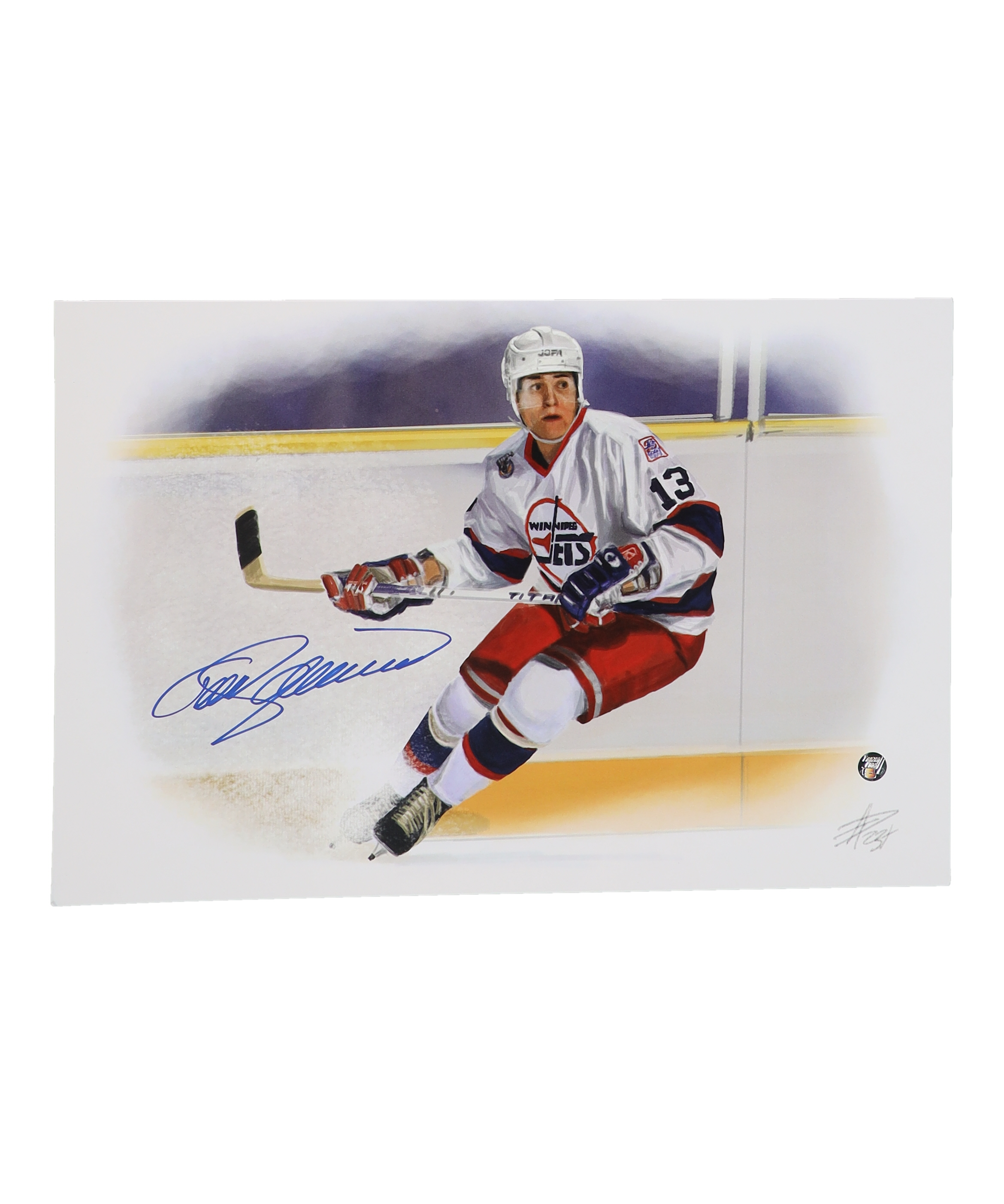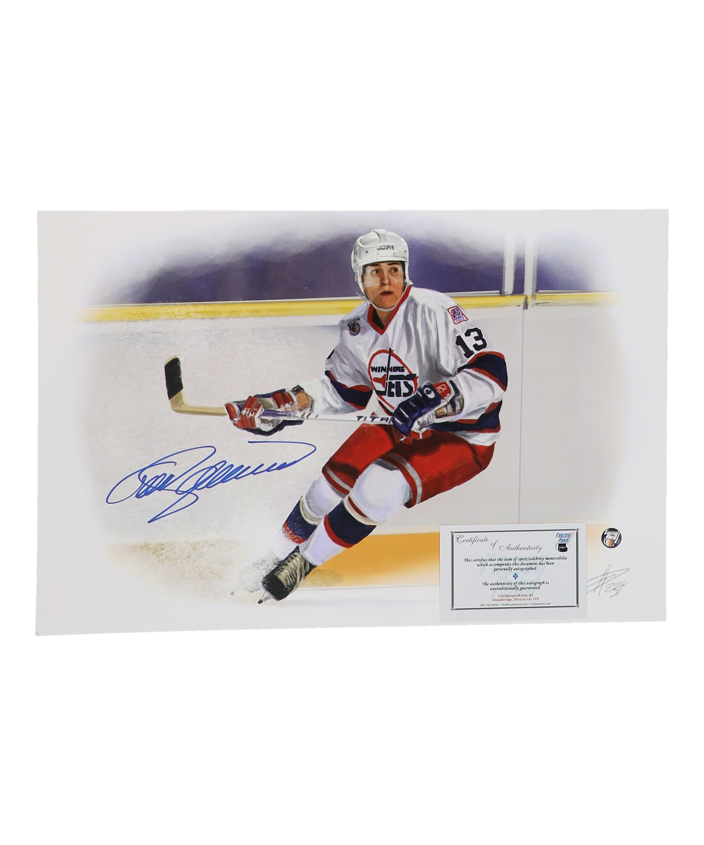 Lithograph measures approximately 12" x 18" in size. Hand-signed by Teemu Selanne (Winnipeg Jets, HOF). Has also been signed by the artist Alex Douglas. Limited edition numbered #/5.
