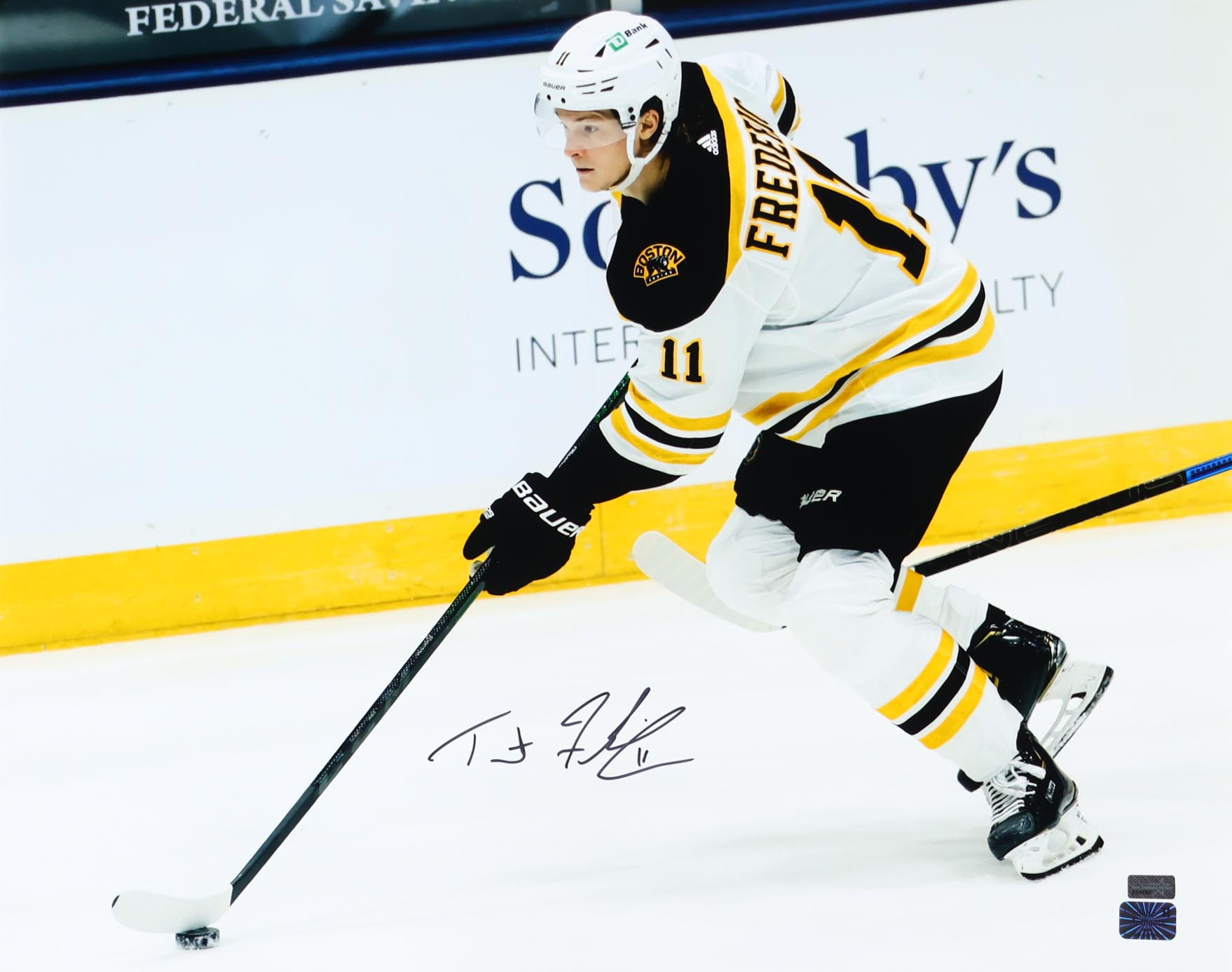 Photo measures 16" x 20" in size and has been hand-signed by Trent Frederic (Boston Bruins).