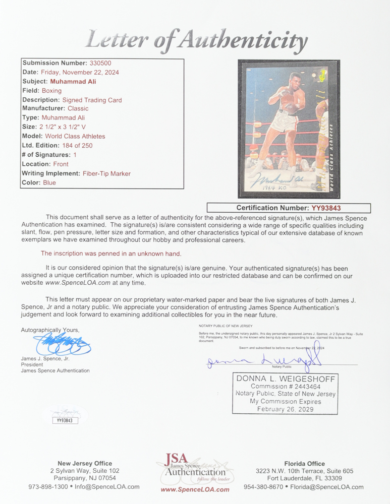 1992 Classic World Class Athletes #34 Trading Card has been hand-signed by Muhammad Ali (HOF, D 2016). Please note inscription is not in Ali's hand writing.