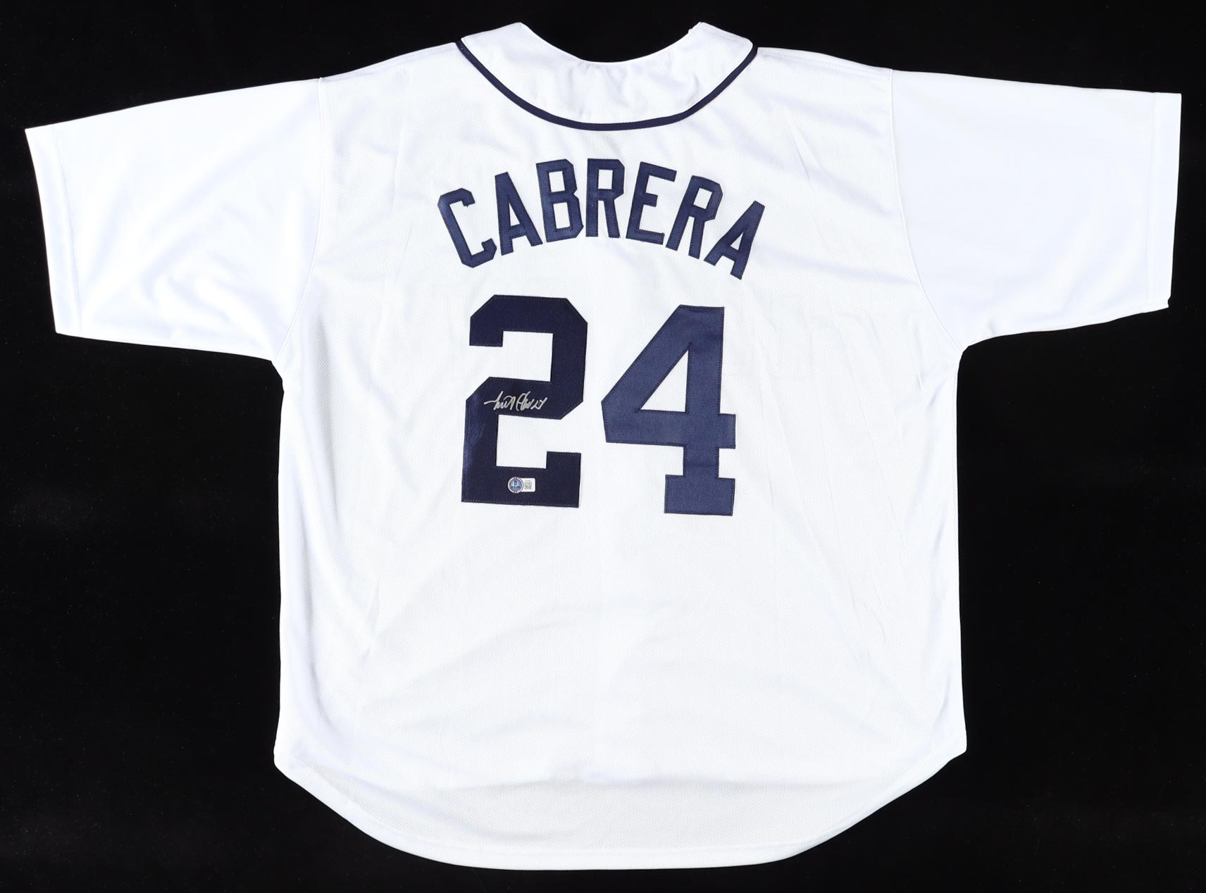 Custom jersey with everything sewn on, size XL. Hand-signed by Miguel Cabrera.