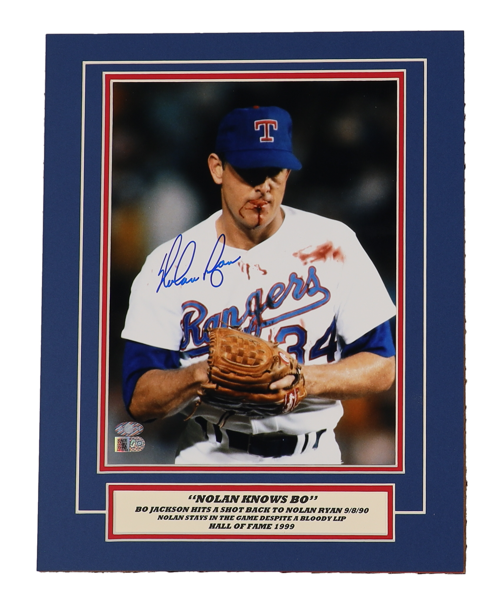Display measures 11" x 14" in size and features a photo that has been hand-signed by Nolan Ryan (Texas Rangers, HOF).