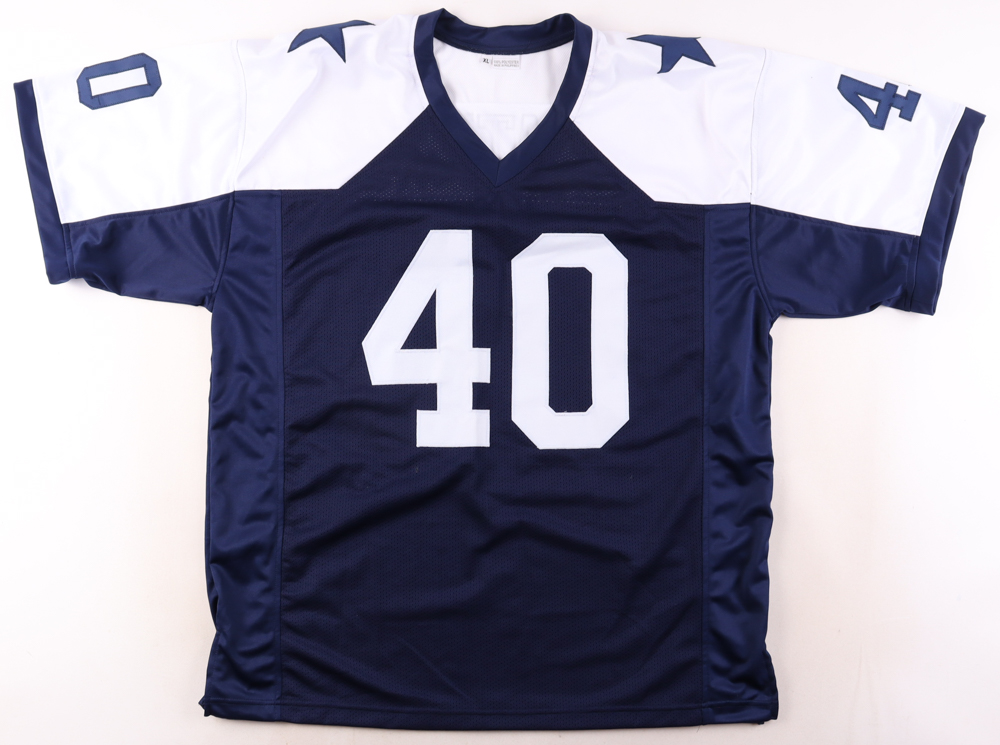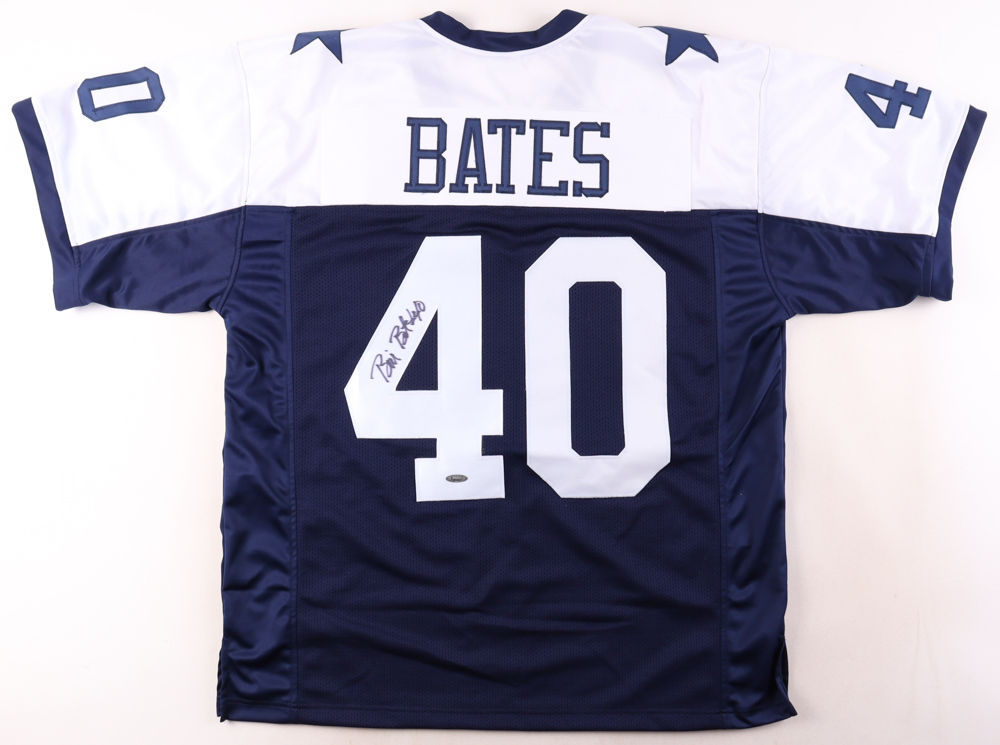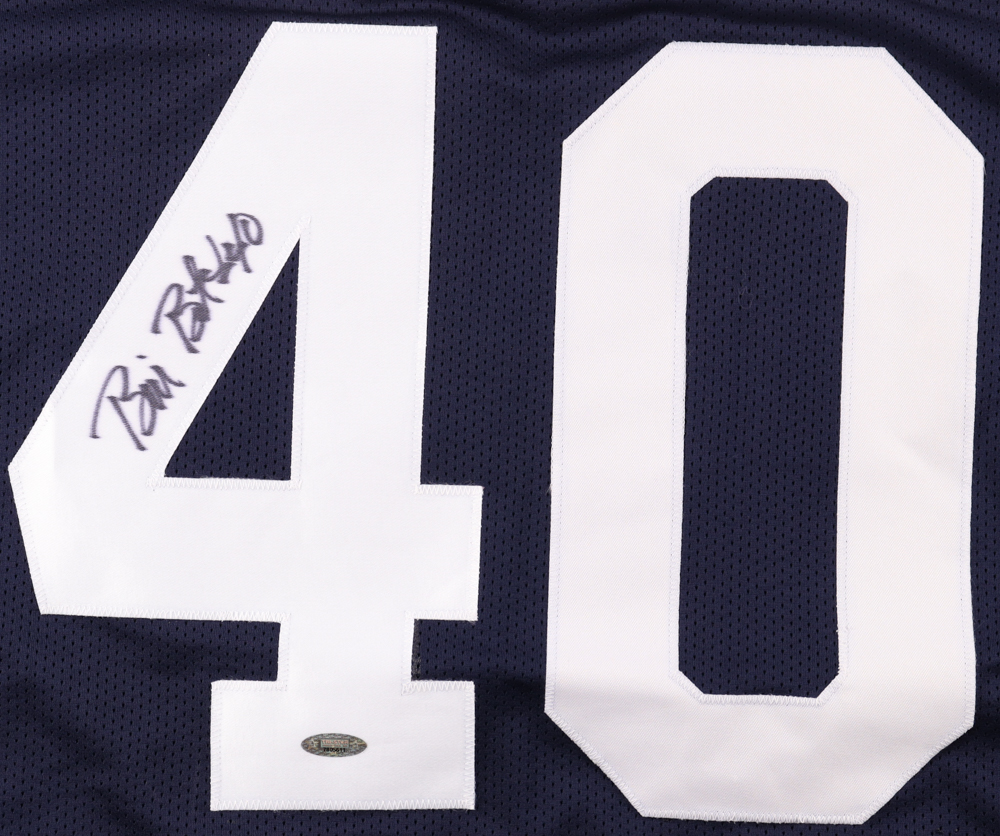 Custom jersey with everything sewn on, size XL. Hand-signed by Bill Bates. Please note, the signature has bled.
