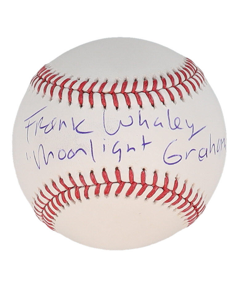 Rawlings Official Major League Baseball. Hand-signed and inscribed by Frank Whaley (Archie "Moonlight" Graham). Please note, there are stains on the baseball.