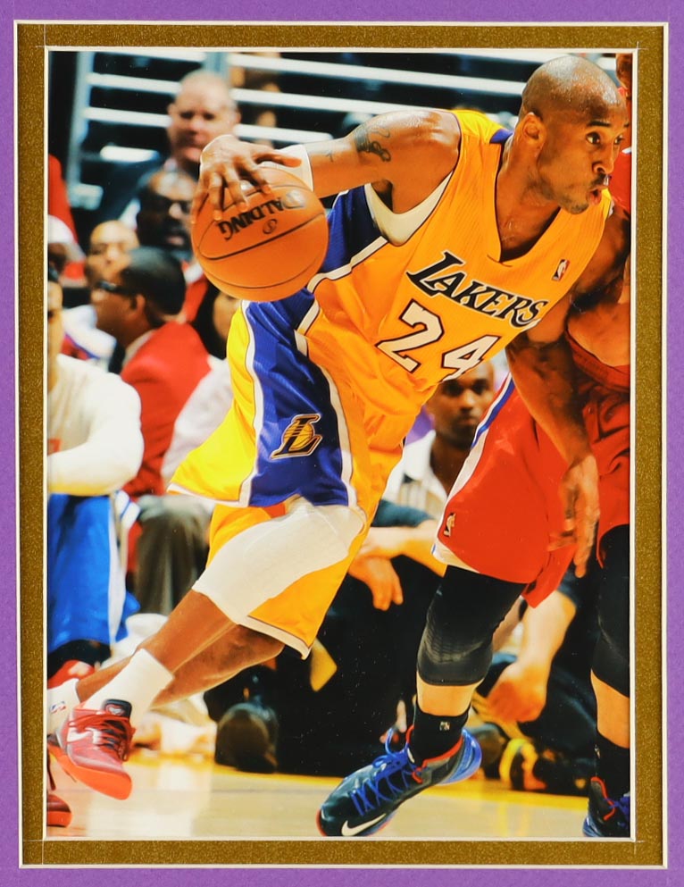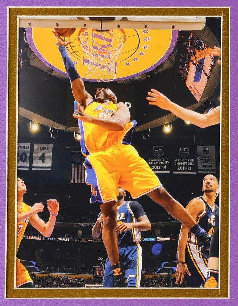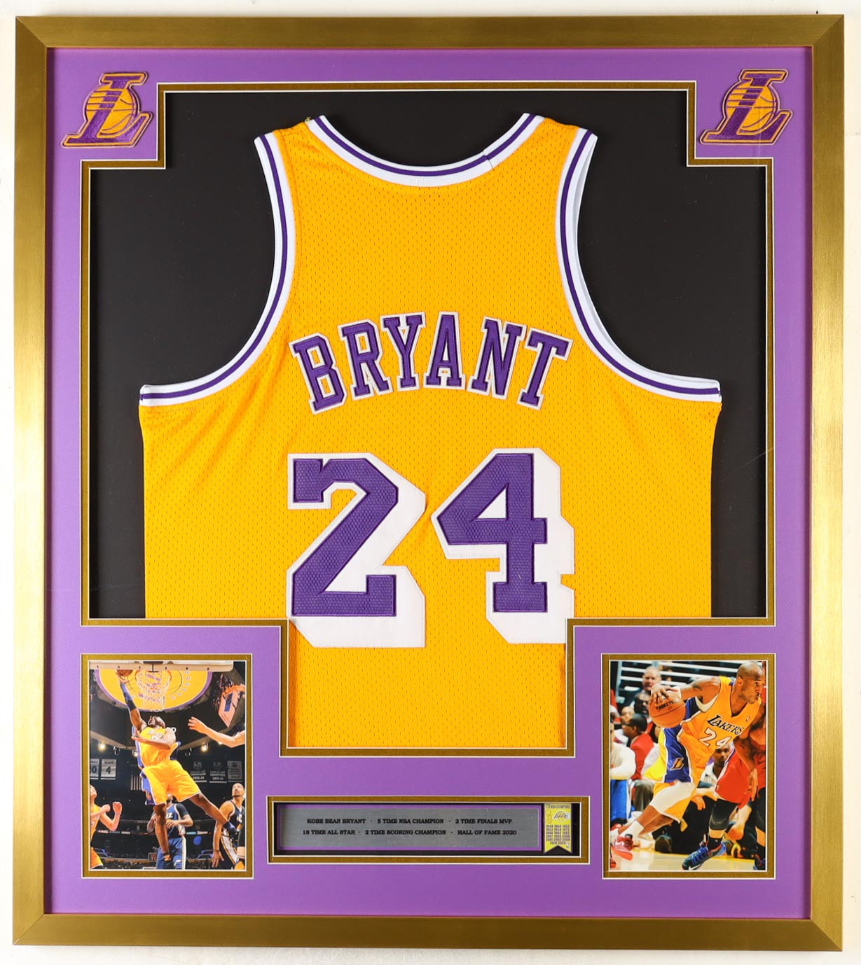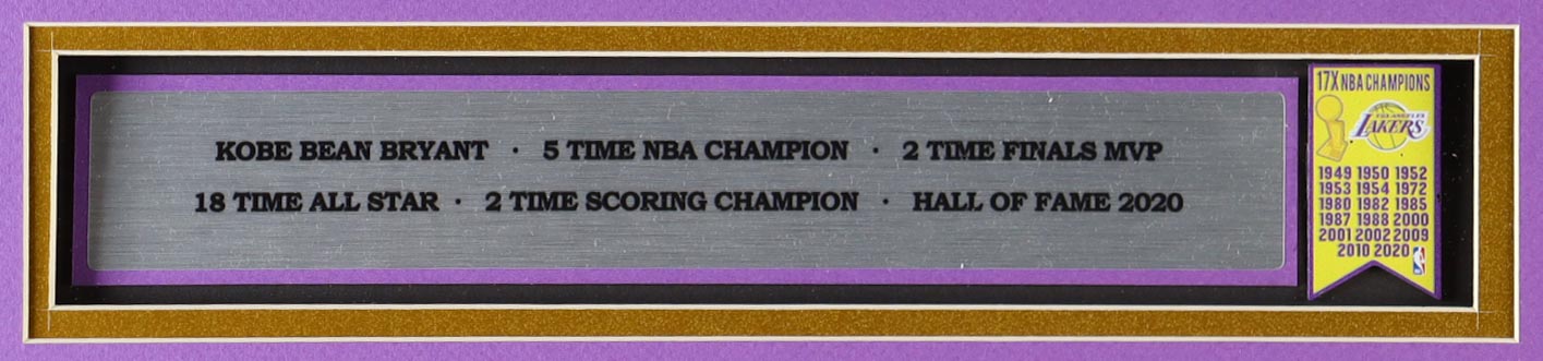 Custom frame measures 32" x 36" in size and features an unsigned jersey of Kobe Bryant. This display also features a Los Angeles Lakers Mini Banner and (2) Los Angeles Lakers logo patches.
