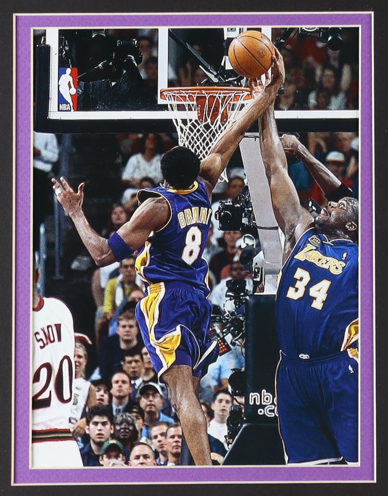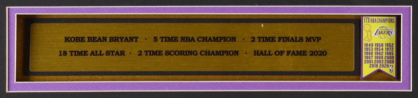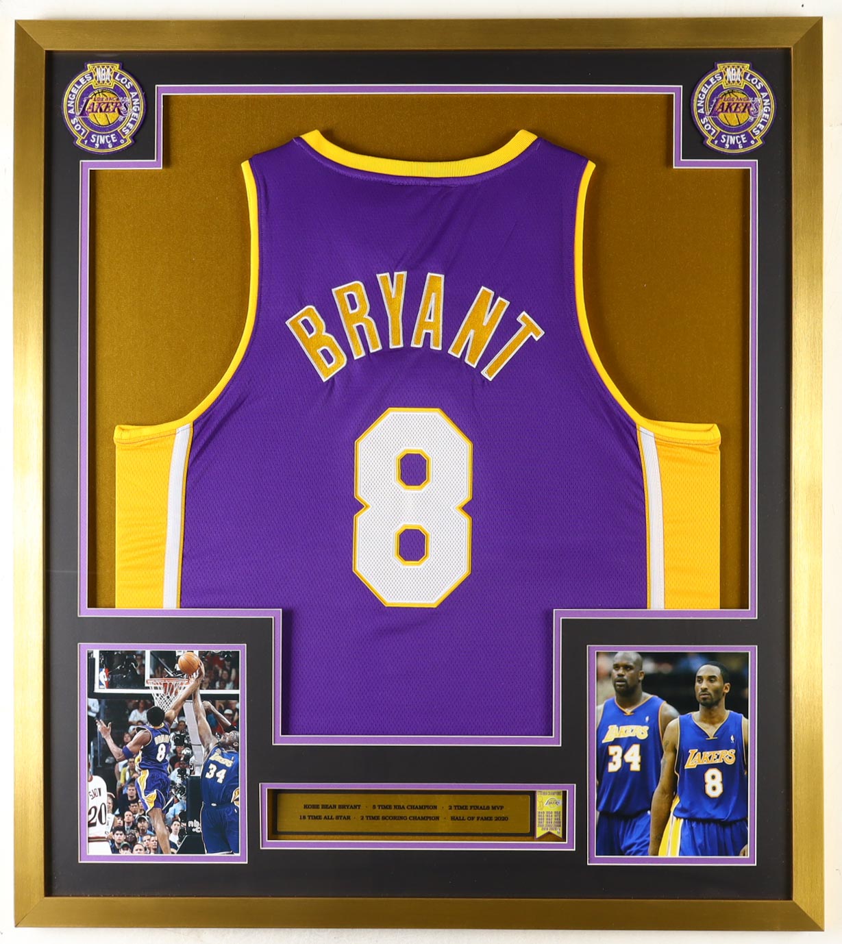 Custom frame measures 32" x 36" in size and features an unsigned jersey of Kobe Bryant. This display also features a Los Angeles Lakers Mini Banner and (2) Los Angeles Lakers logo patches.