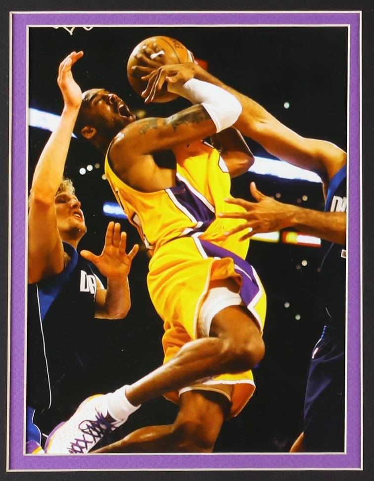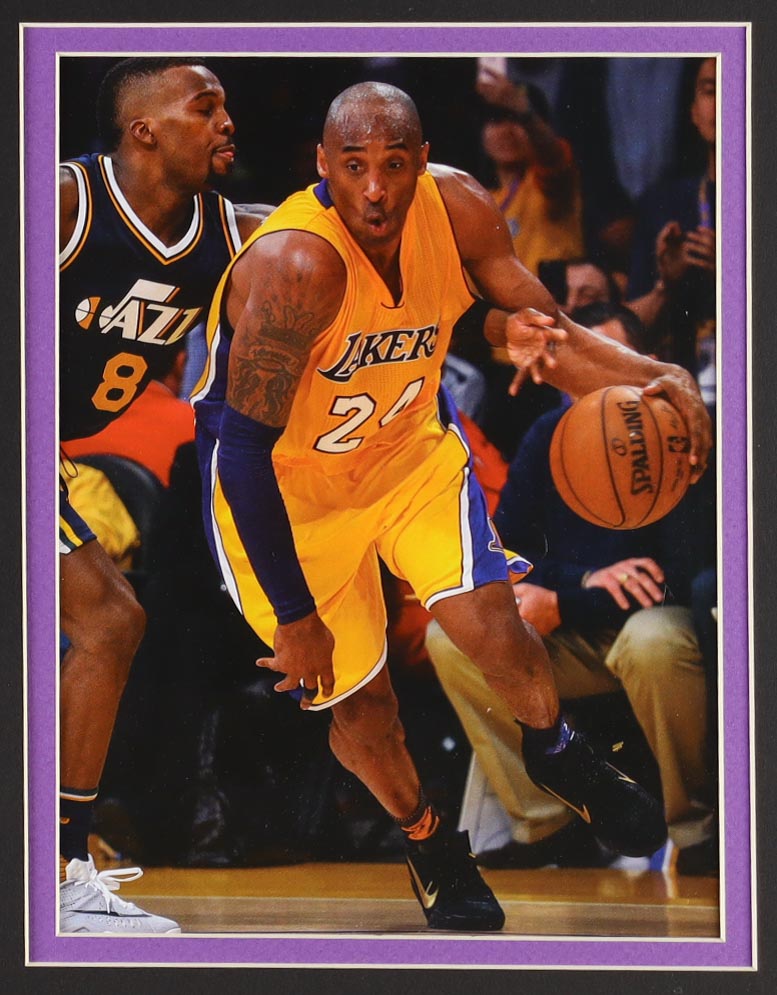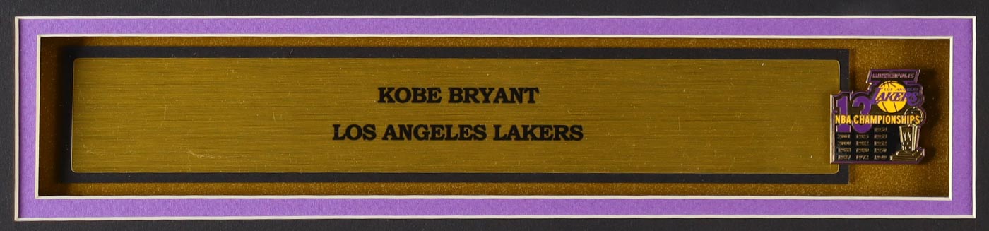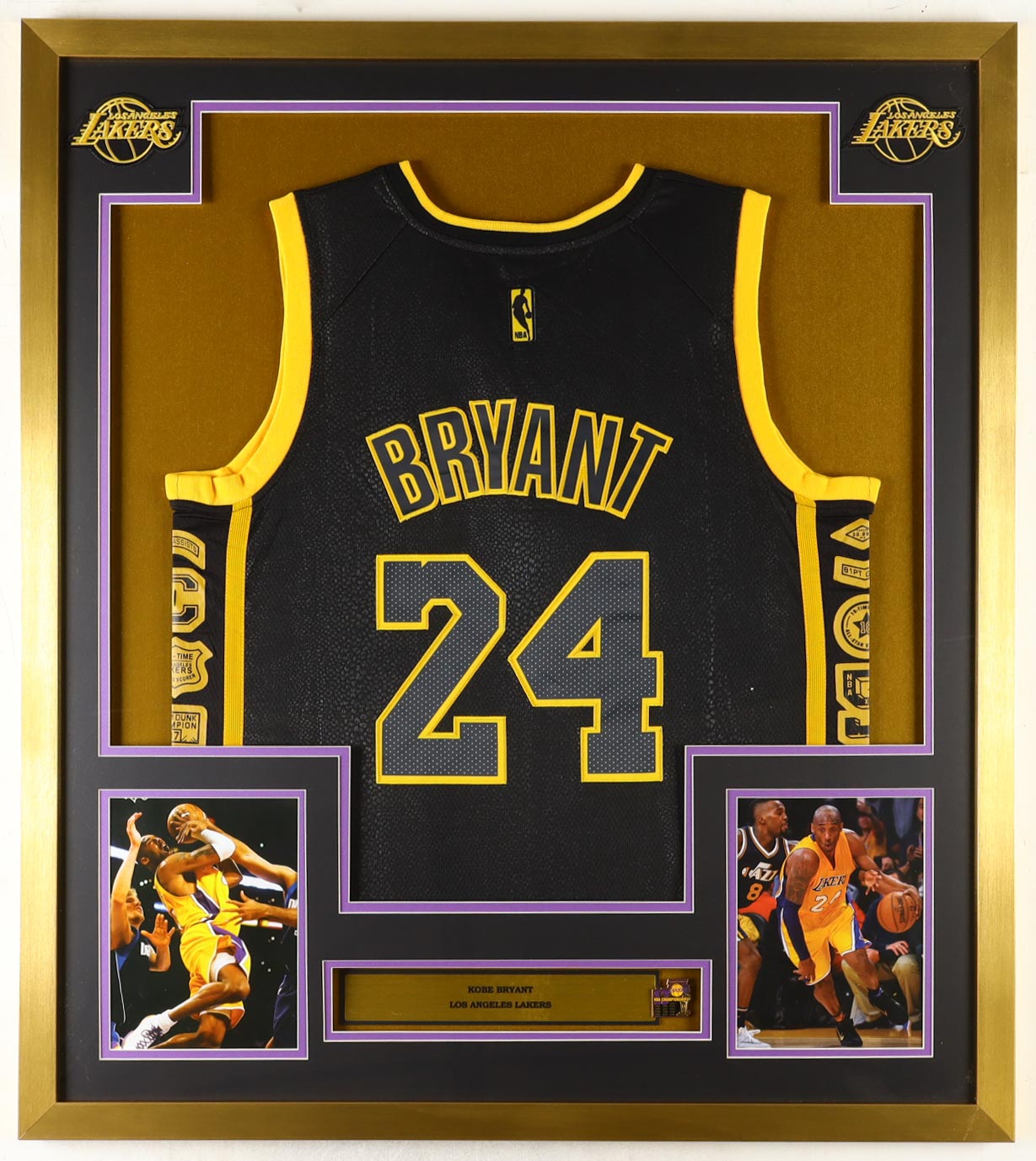 Custom frame measures 32" x 36" in size and features an unsigned jersey of Kobe Bryant. This display also features a Los Angeles Lakers 12x NBA Champions pin and (2) Los Angeles Lakers logo patches.