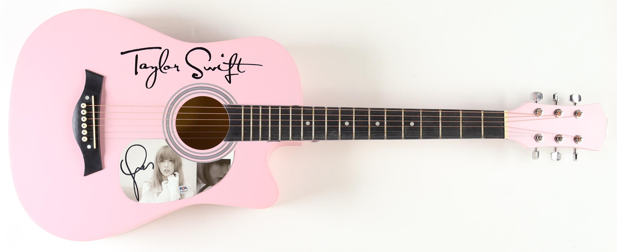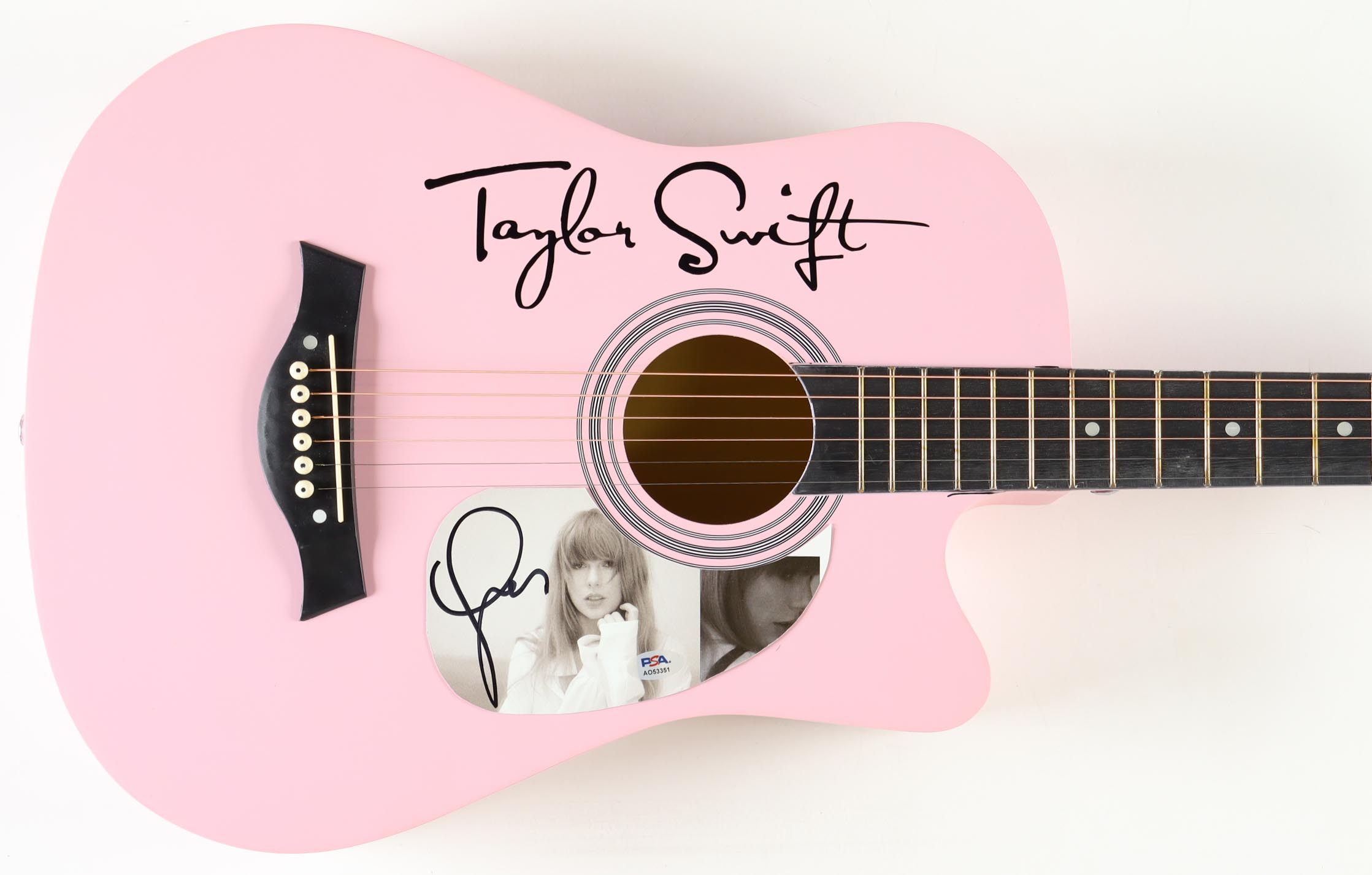 Acoustic guitar measures approximately 38" in length and has been hand-signed on cut that has been repurposed as a pick-guard by Taylor Swift.