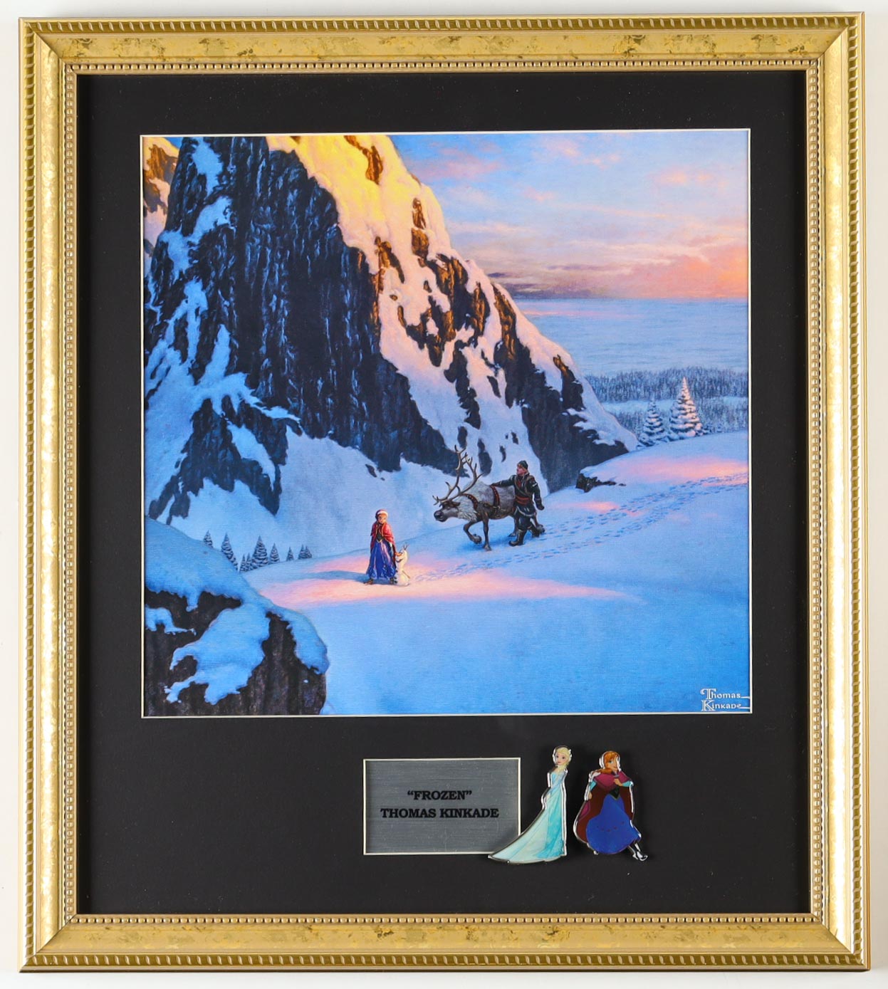 Custom frame display measures approximately 16" x 18" in size and features an unsigned print from "Frozen" by Thomas Kinkade (D. 2012). The display also includes Princess Elsa and Anna Character pins. Please note, display is unsigned.
