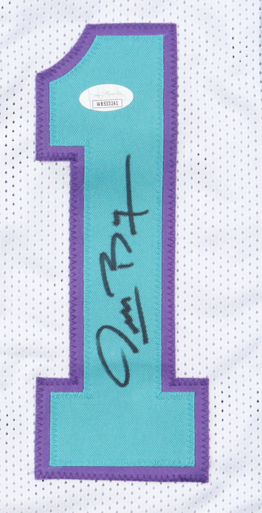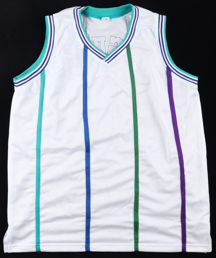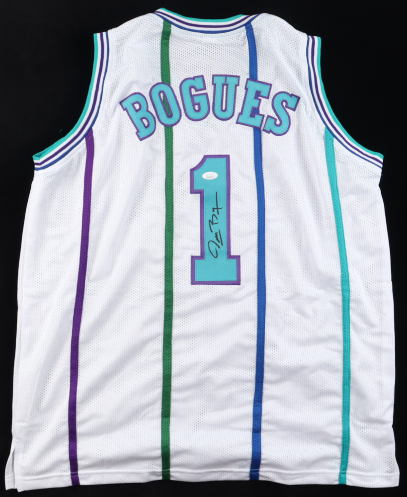 Custom jersey with everything sewn on, size XL. Hand-signed by Muggsy Bogues.