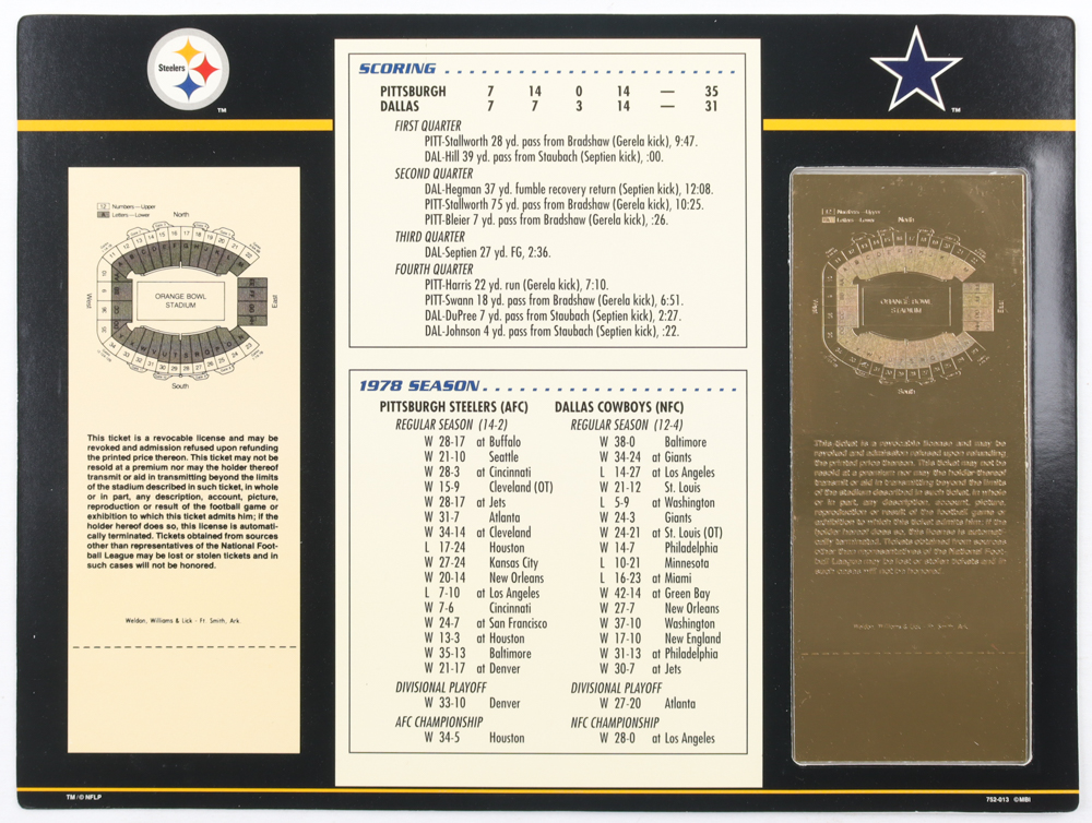 Super Bowl XIII Commemorative Score Card with 23KT Gold Ticket