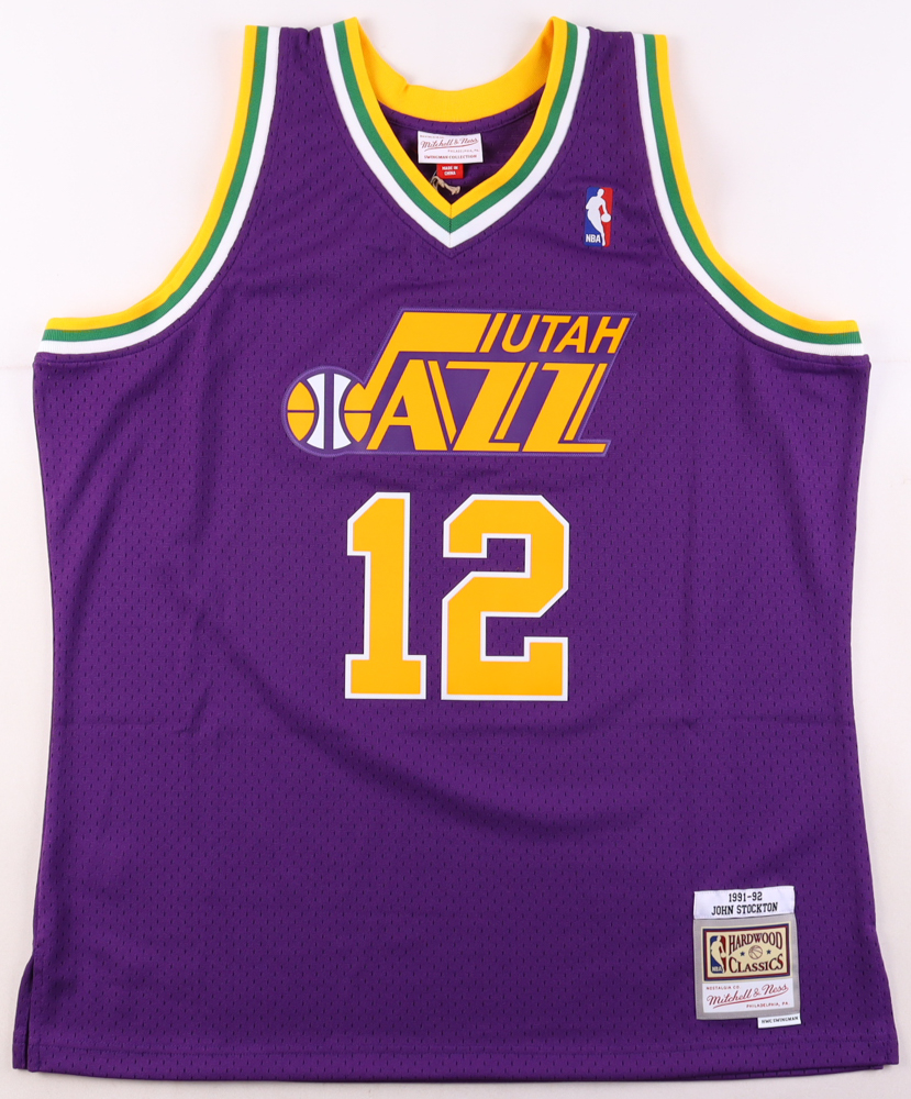 1991-92 Mitchell & Ness Hardwood Classics Swingman style jersey with everything sewn on, size XL. Hand-signed by John Stockton (Utah Jazz, HOF).