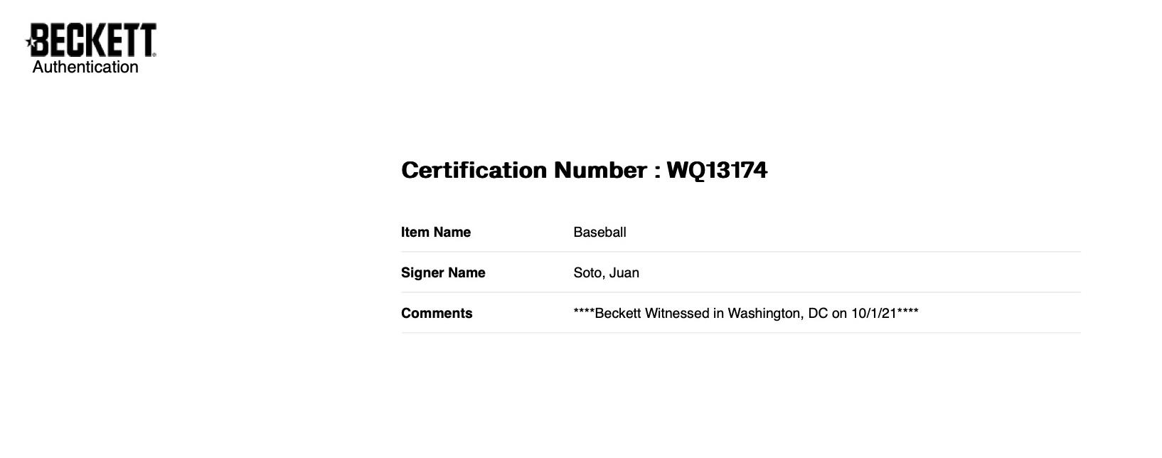 The autograph includes an official Beckett Authentication Services serially numbered hologram for authenticity purposes. The signing of this item was witnessed by Beckett.