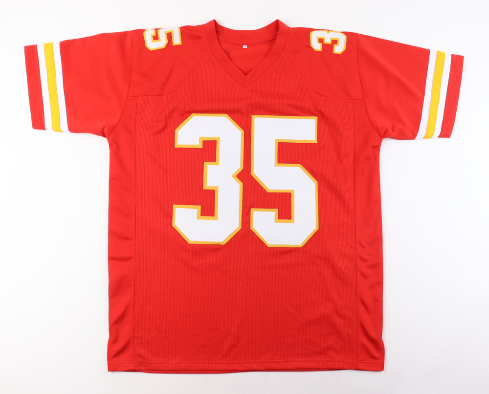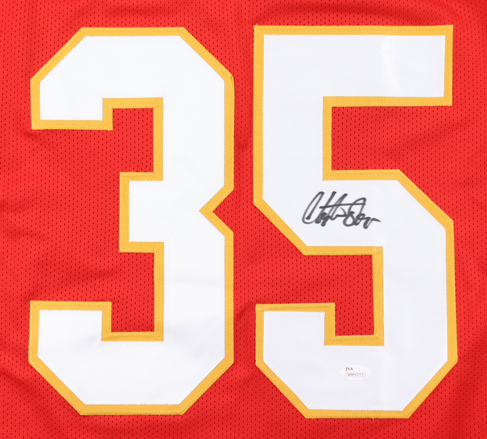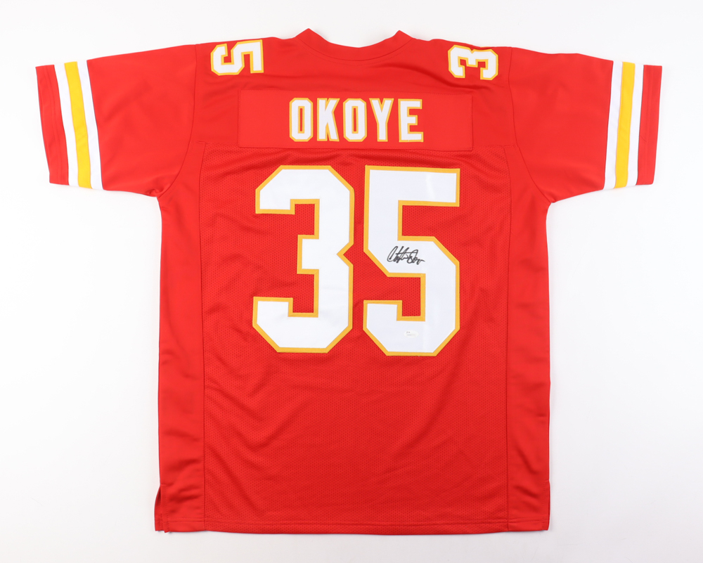 Custom jersey. Everything is sewn on, size XL. Hand-signed by Christian Okoye.
