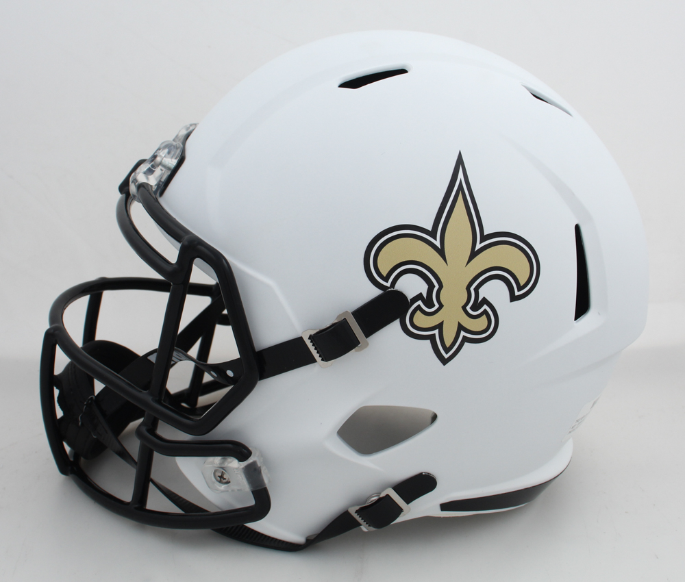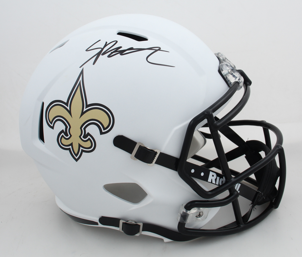 Riddell New Orleans Saints full-size replica Lunar Eclipse Alternate Speed helmet. Hand-signed by Spencer Rattler. Please note, there is slight scuffing on the side of the helmet.