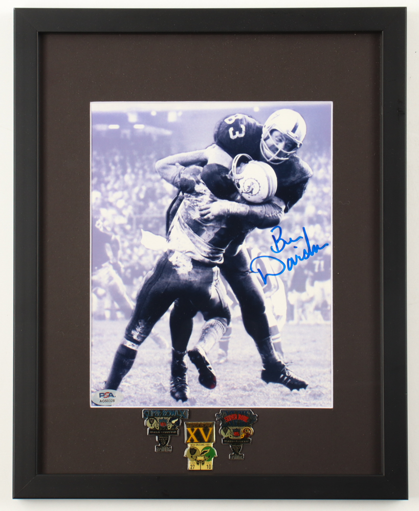 Custom frame measures 12" x 15" in size and features a photo that has been hand-signed by Ben Davidson (D. 2012, Oakland Raiders). Display also features (3) Oakland Raiders Super Bowl pins.