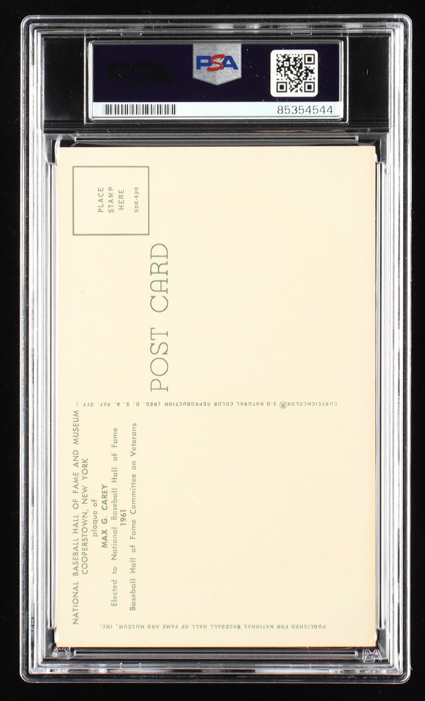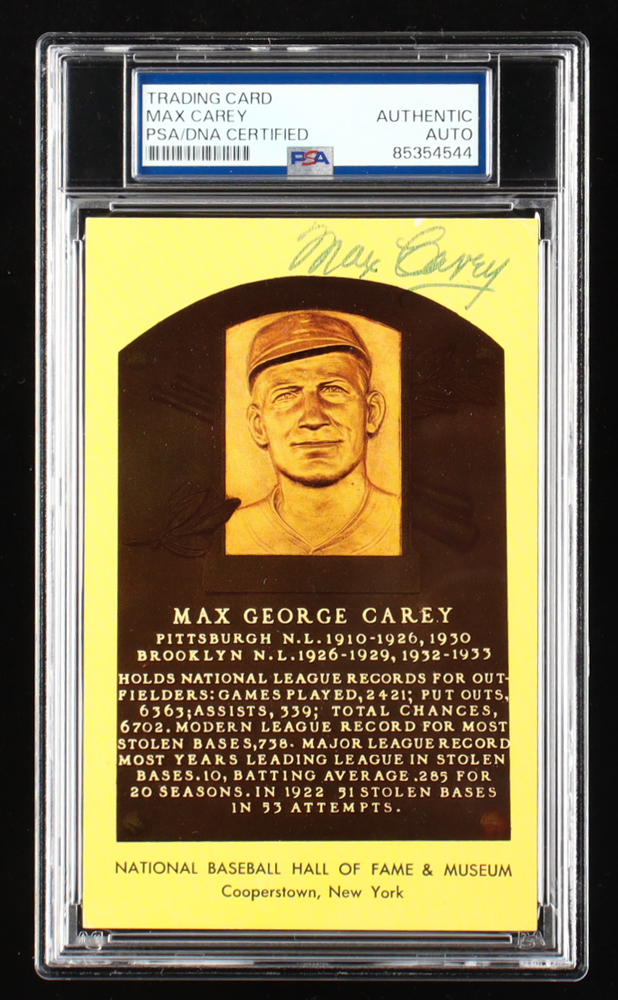 Max Carey Signed Hall of Fame Plaque Postcard (PSA)