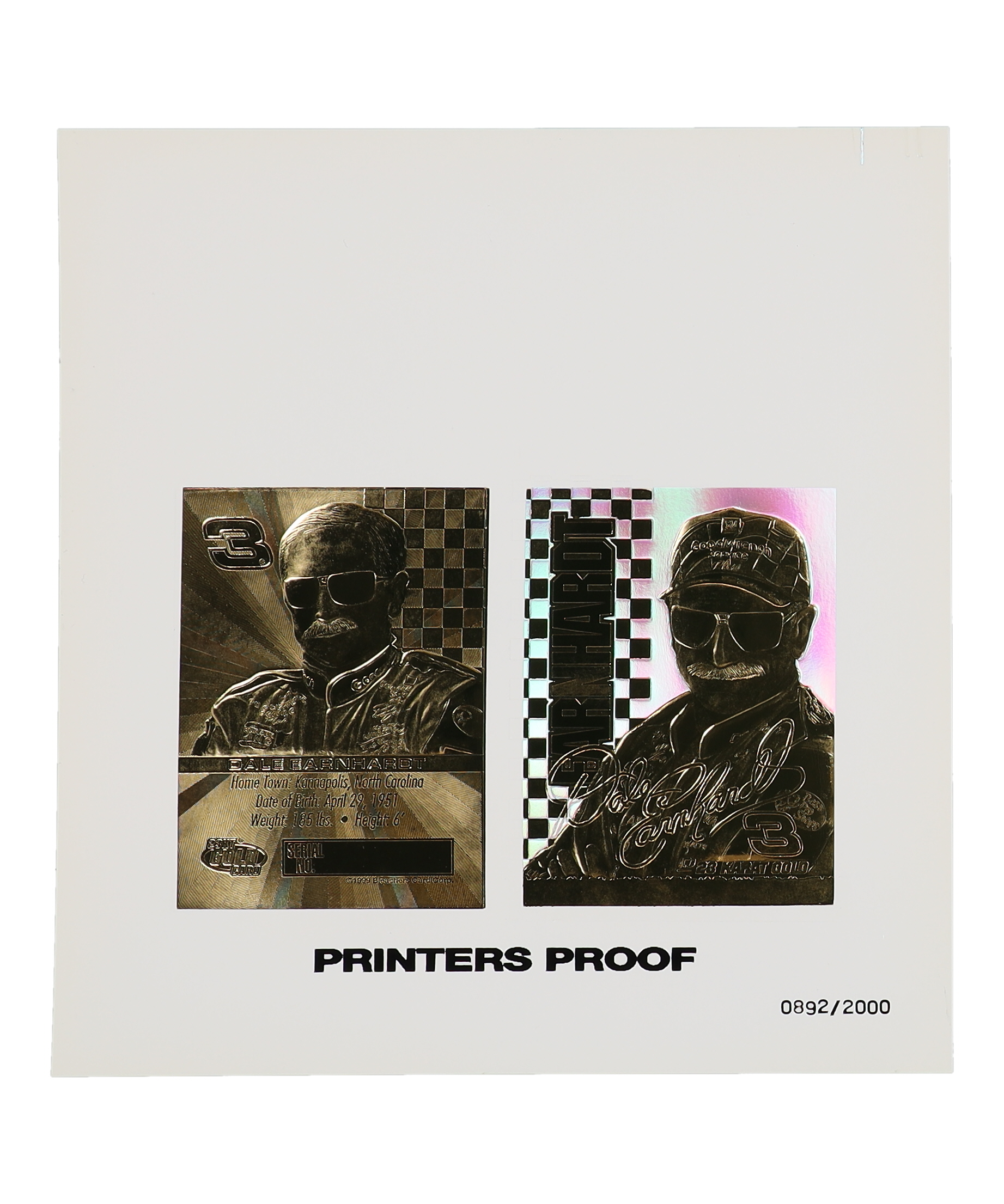 Printer's proof sheet of a Dale Earnhardt 1999 Bleachers 23KT Gold Card. The item is limited edition #892/2000.
