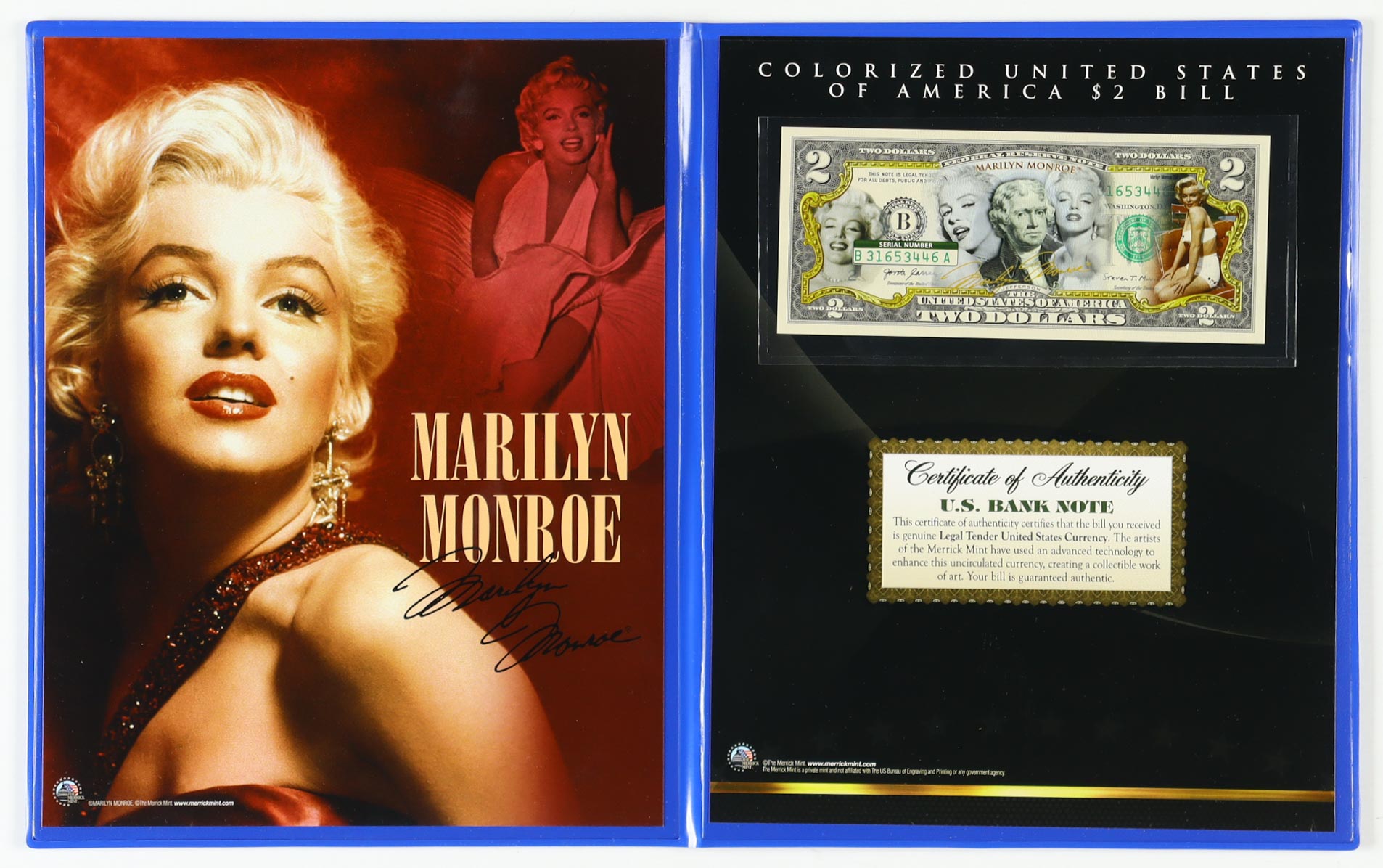 Marilyn Monroe Genuine Legal Tender Colorized U.S. $2 Bill Commemorative Edition Bank Note. Includes folder as shown. Please note, Monroe's autograph is a facsimile.