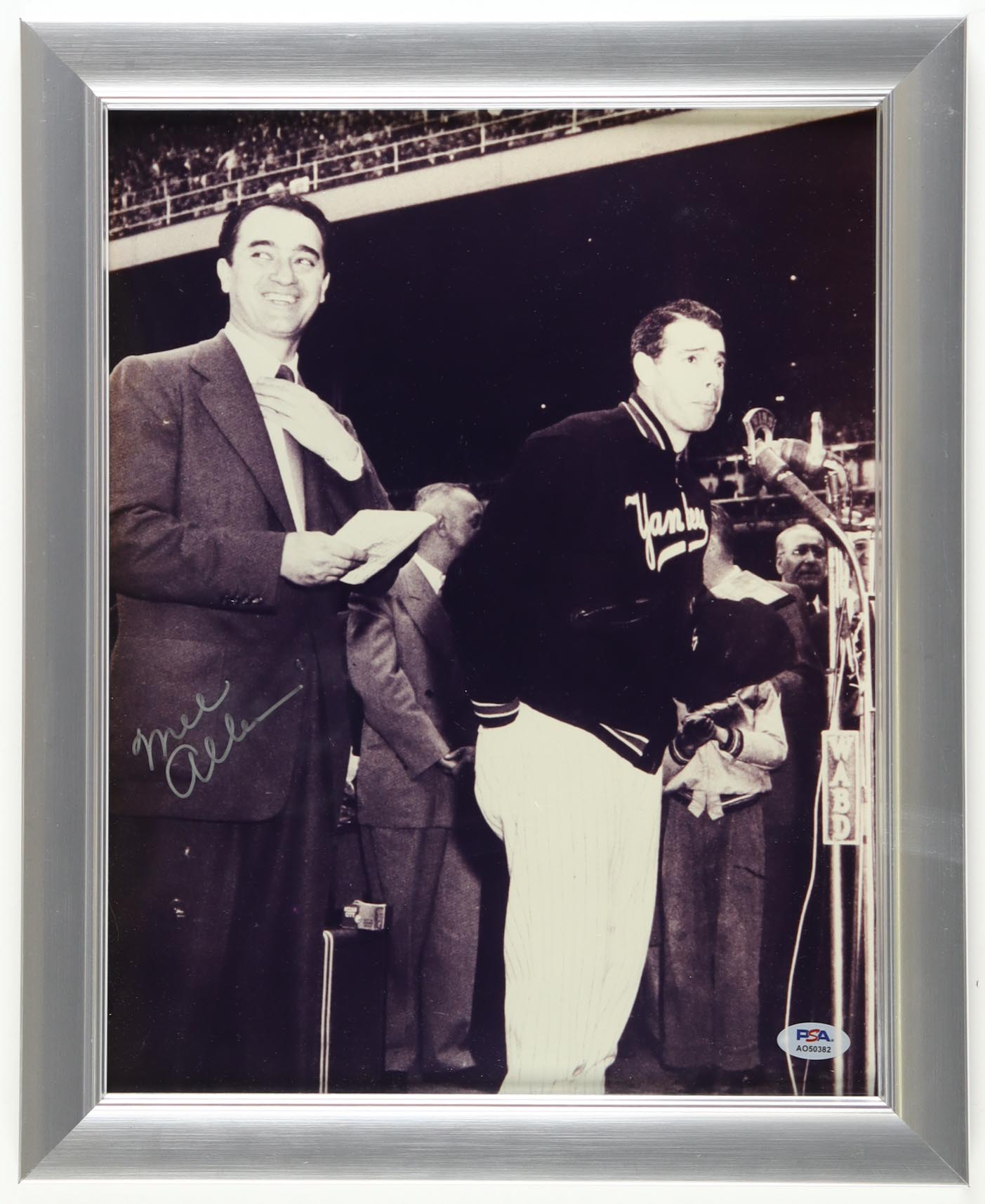 Custom frame measures approximately 13" x 16" in size and features a photo that has been hand-signed by Mel Allen (D. 1996).