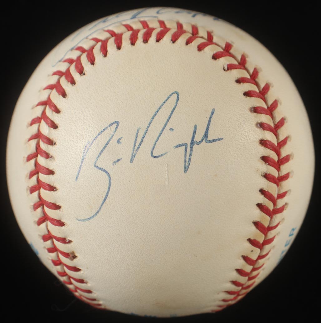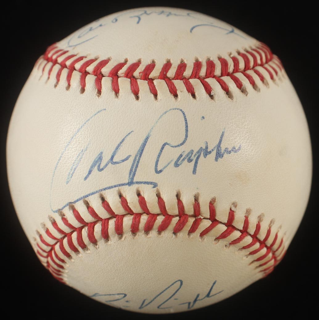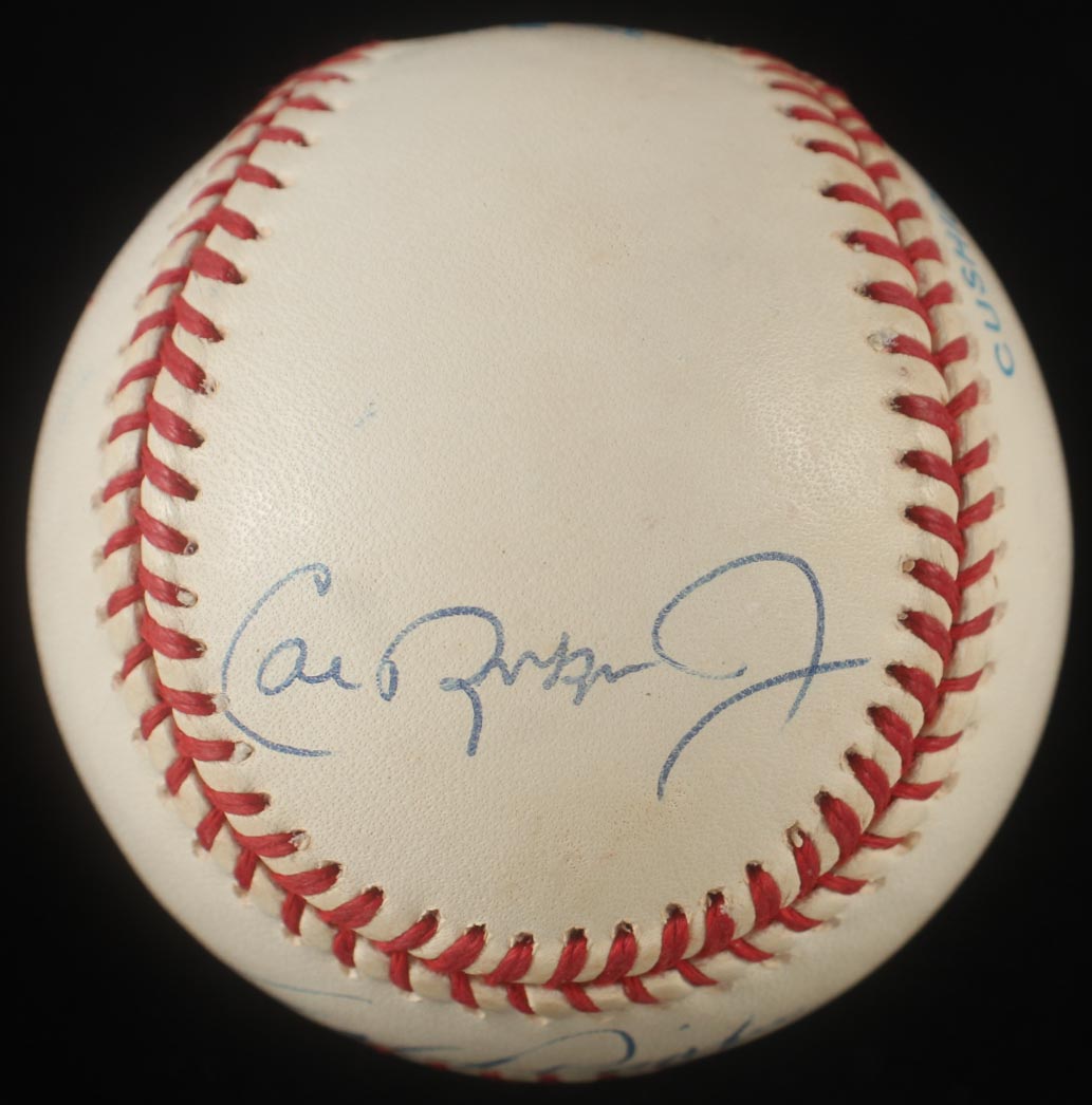 Rawlings Official American League baseball has been hand-signed by Cal Ripken Jr. (HOF), Cal Ripken (D. 1999) and Billy Ripken (Baltimore Orioles).