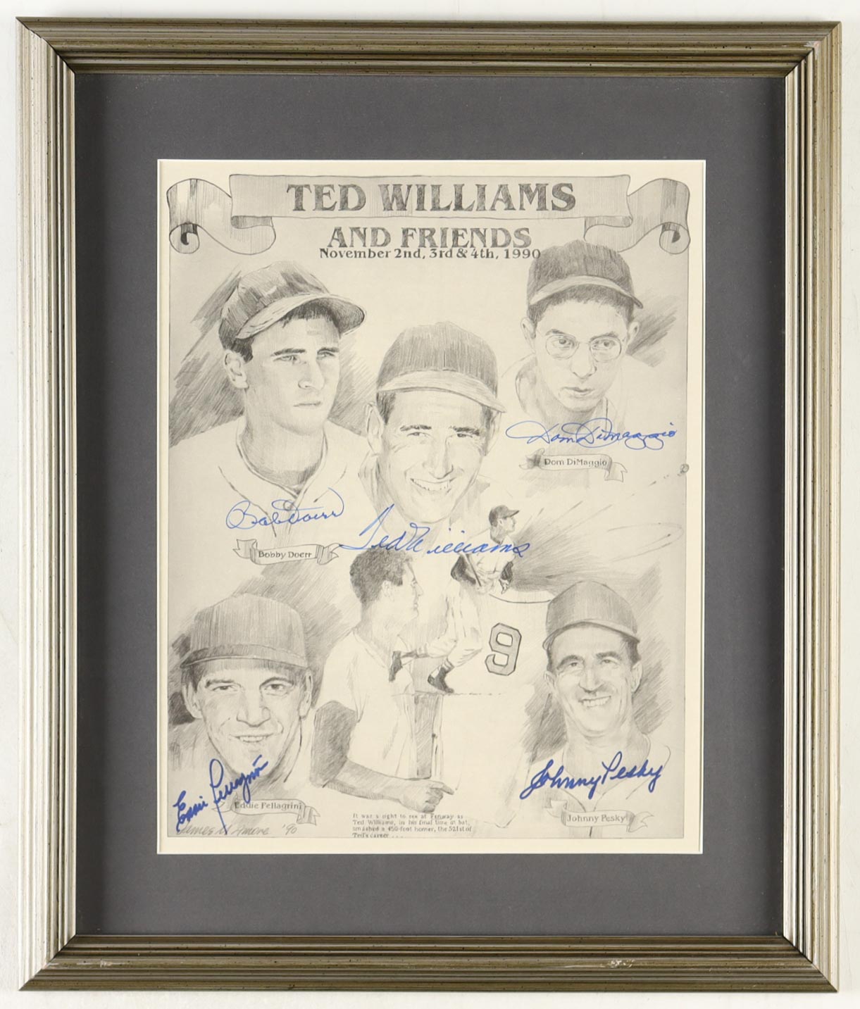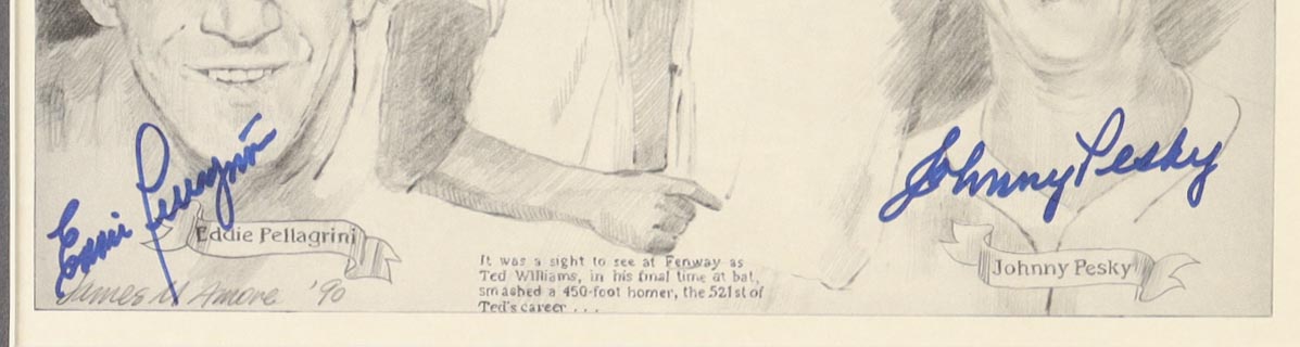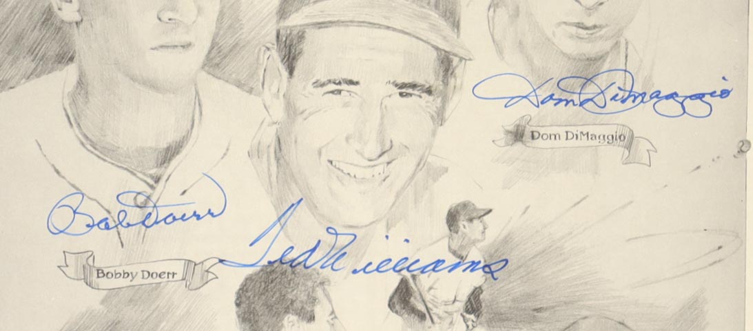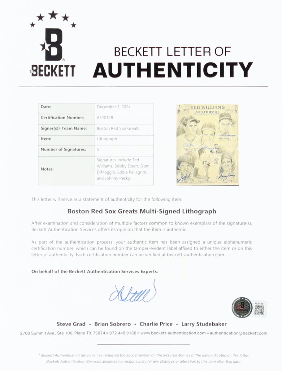 Custom frame measures 16.5” x 19.5” in size and features a photo that has been hand-signed by Ted Williams (D. 2002, HOF), Bobby Doerr (D. 2017, HOF), Dom DiMaggio (D. 2009), Eddie Pellagrini (D. 2006) and Johnny Pesky (D. 2012).