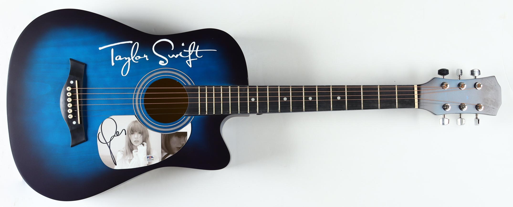 Acoustic guitar measures approximately 38" in length and has been hand-signed on a cut that has been repurposed as the pick-guard by Taylor Swift.