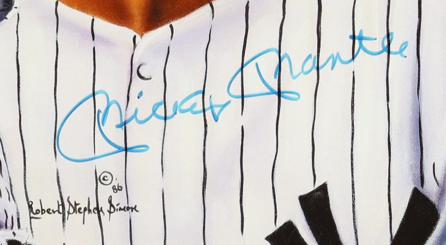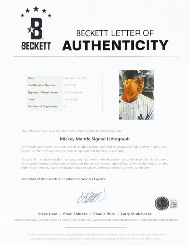 Custom frame measures 19.5” x 23.5” in size and features a lithograph that has been hand-signed by Mickey Mantle (D. 1995, New York Yankees, HOF).