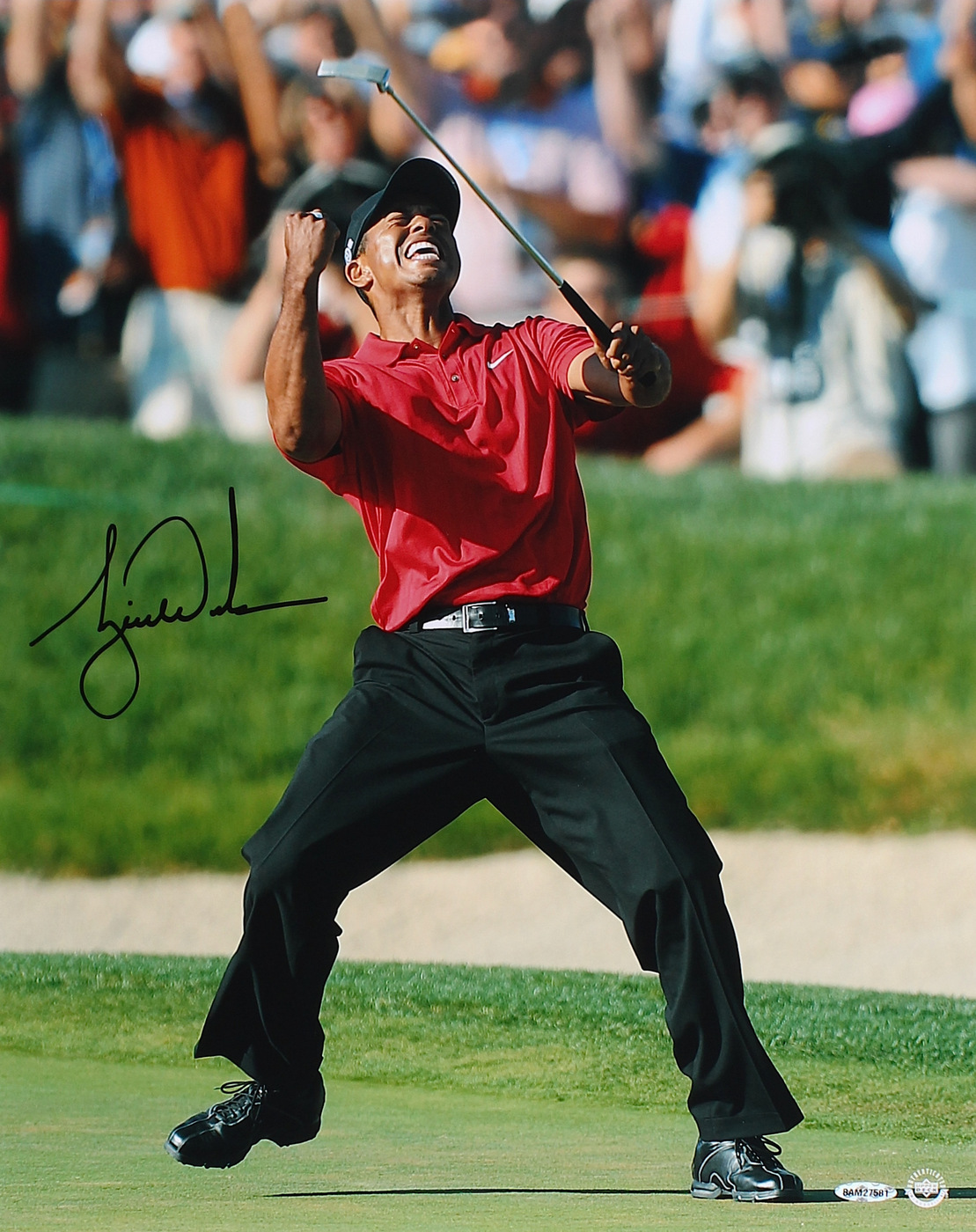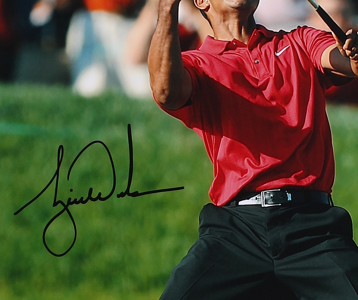 Photo measures 16" x 20" in size and has been hand-signed in black felt-tip pen by Tiger Woods.
