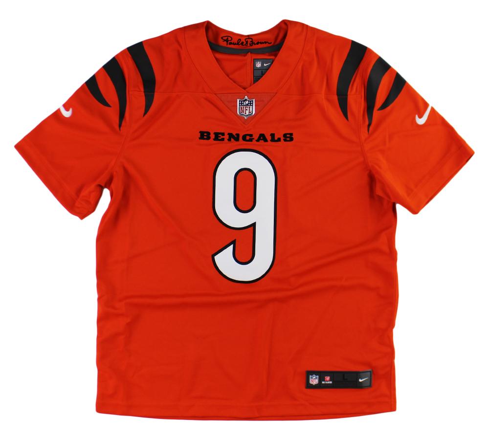 Nike style jersey with everything sewn on, size L. Hand-signed by Joe Burrow (Cincinnati Bengals).