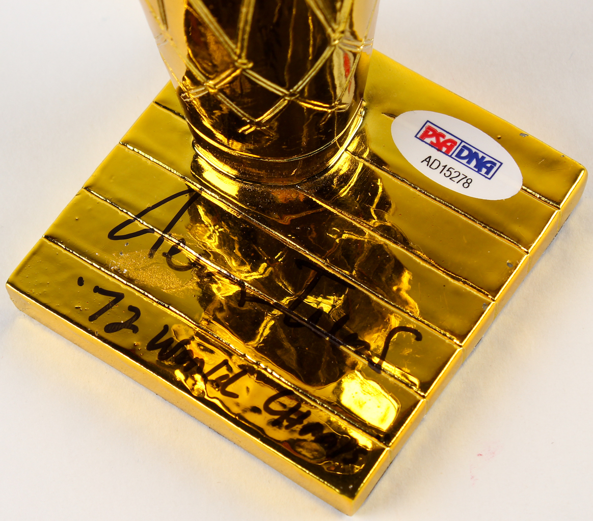 Trophy measures approximately 6.5" tall and has been hand-signed and inscribed in black felt-tip pen by Jerry West (Lakers, HOF).