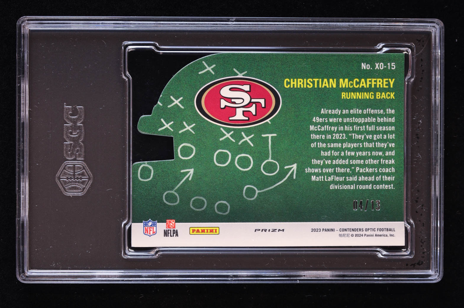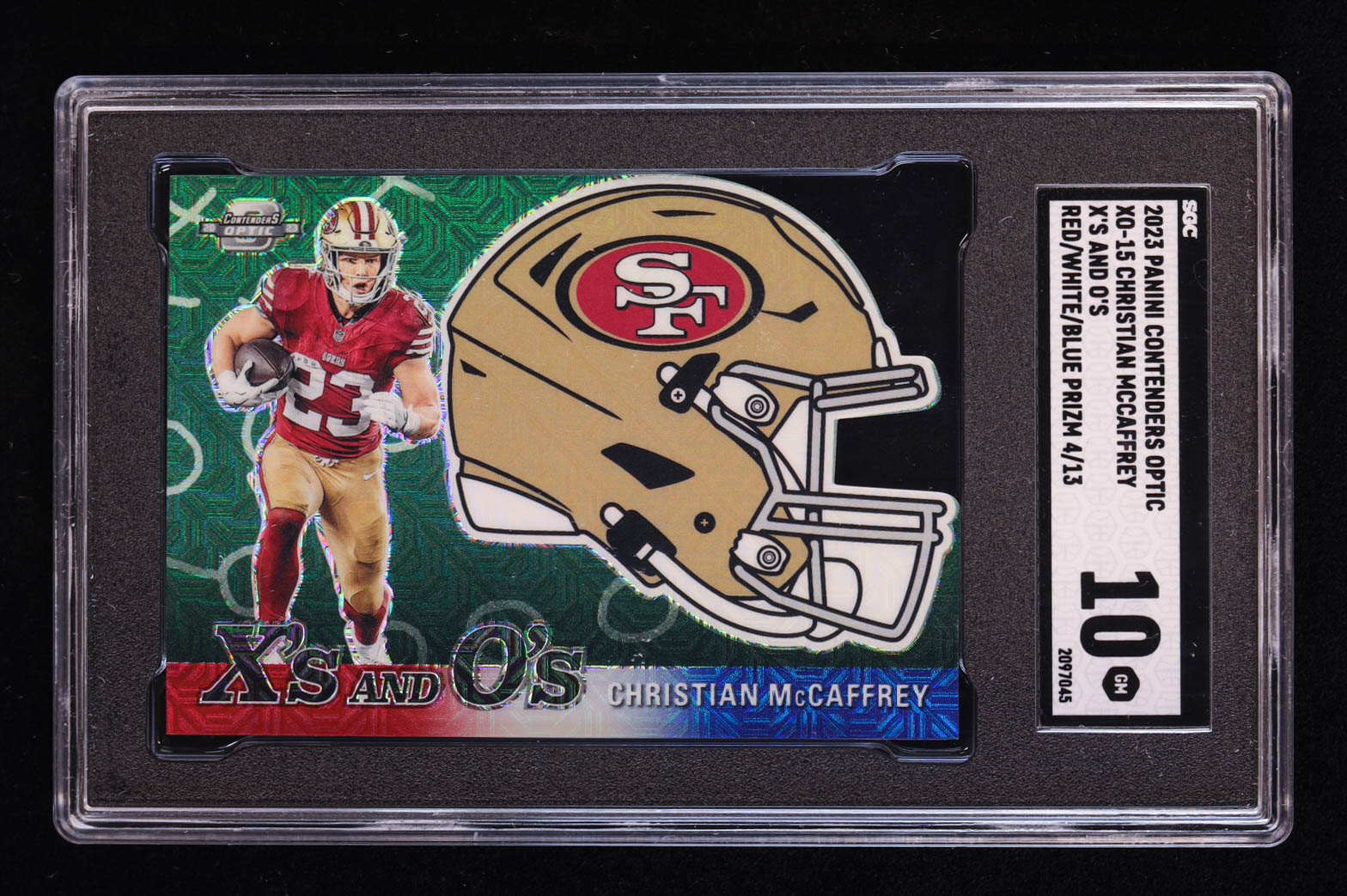 Christian McCaffrey 2023 Panini Contenders Optic Xs and Os Red White and Blue #15 #04/13 (SGC 10)
