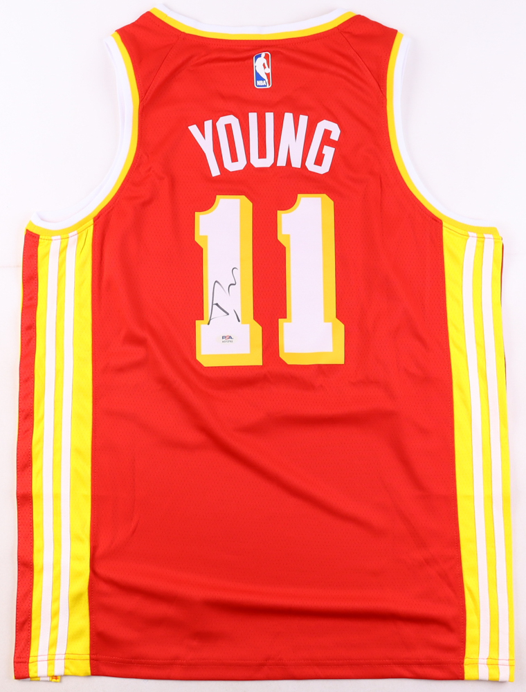 Nike style jersey with everything pressed on, size 48. Hand-signed by Trae Young