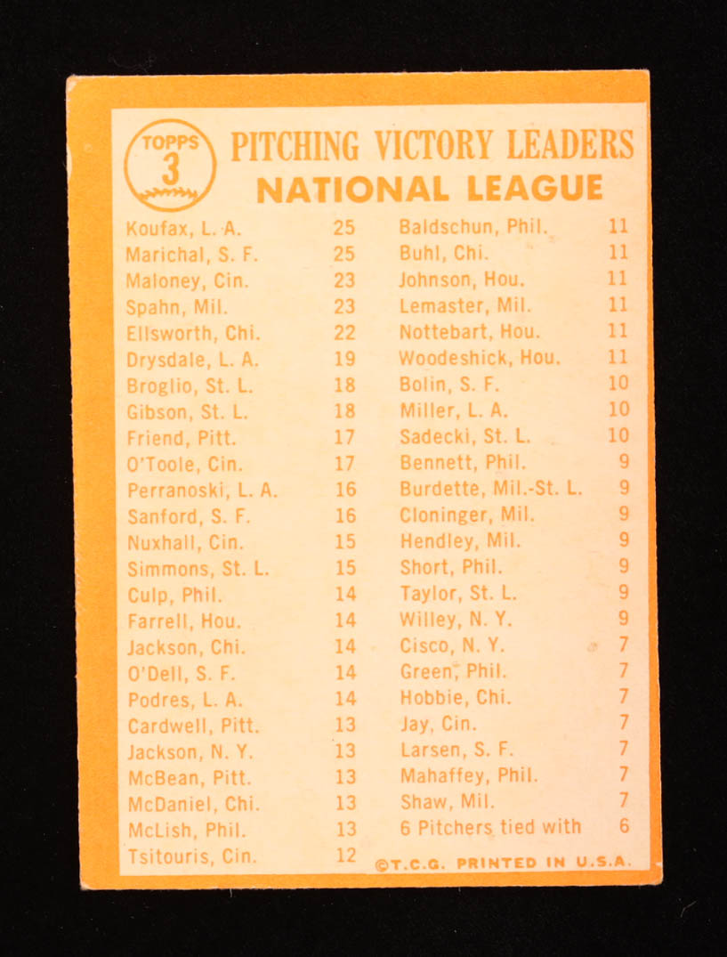 Sandy Koufax / Juan Marichal / Warren Spahn / Jim Maloney 1964 Topps #3 / NL Pitching Leaders