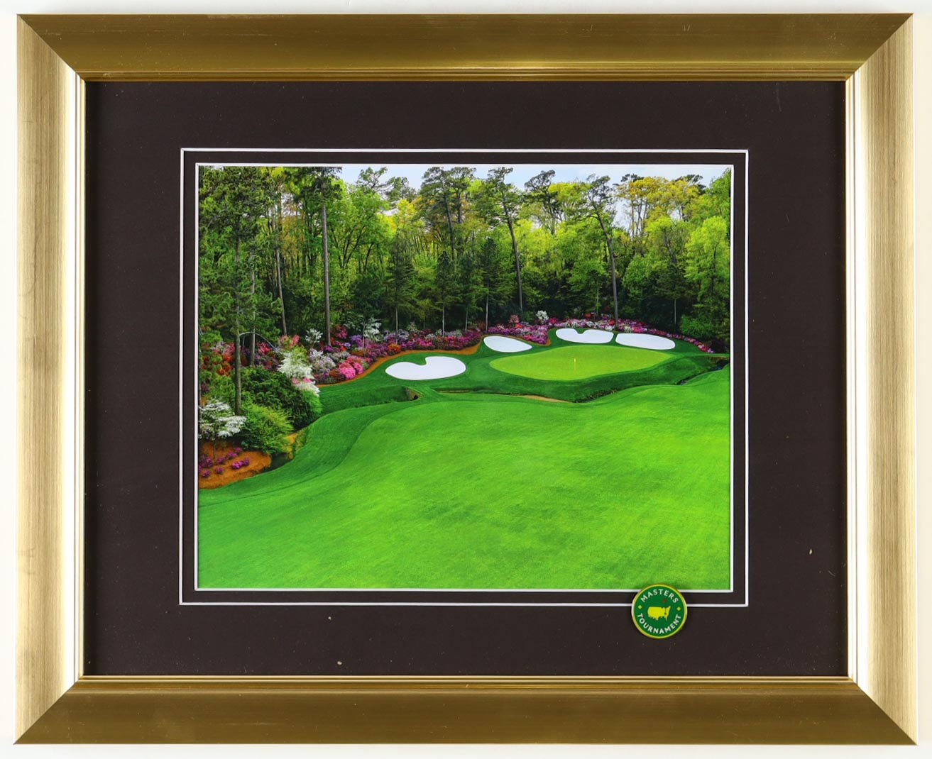 Custom frame measures approximately 13" x 16" in size and features an unsigned course photo, as well as an Official Masters Tournament Pin.