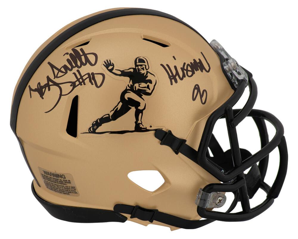 Riddell Heisman Trophy logo speed mini helmet has been hand-signed and inscribed by Troy Smith (Ohio State Buckeyes).