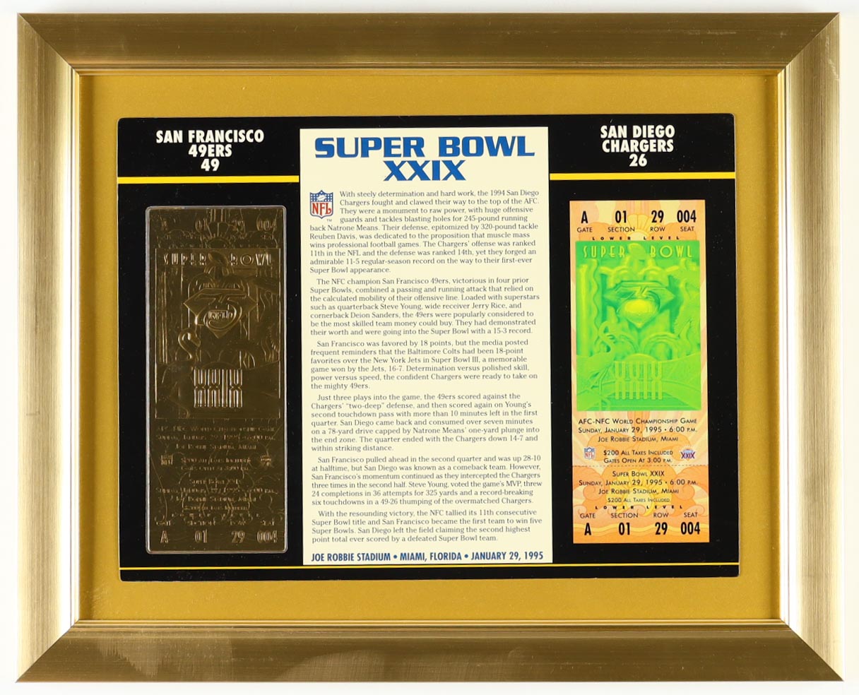 Super Bowl XXIX Commemorative Custom Framed Score Card Display with 23KT Gold Ticket