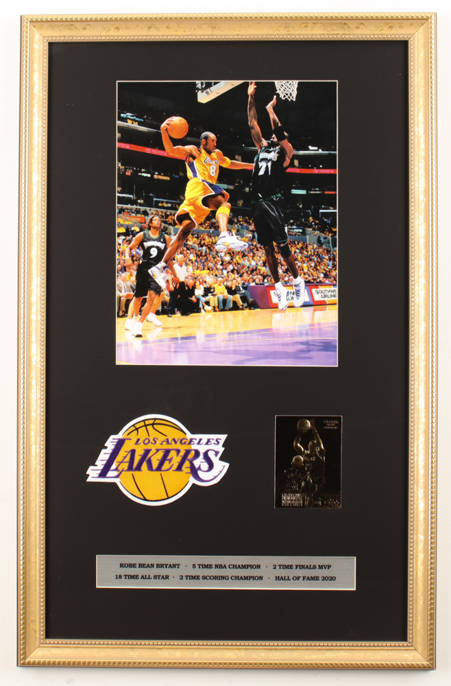 Custom frame measures approximately 16" x 25" in size and features an unsigned photo of Kobe Bryant (D. 2020, Los Angeles Lakers, HOF) as well as a 23KT gold trading card and Los Angeles Lakers cloth patch. Please note, the display is unsigned.