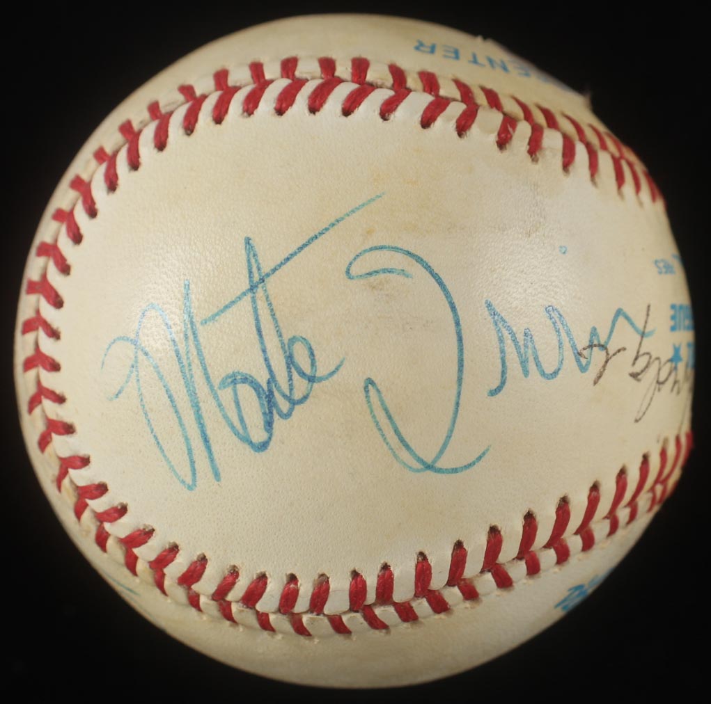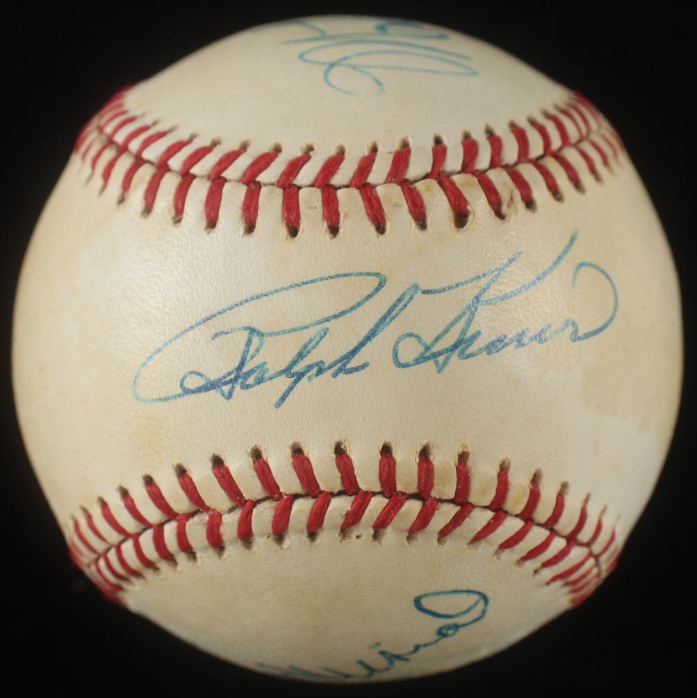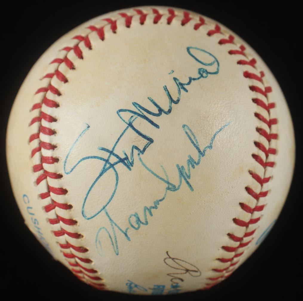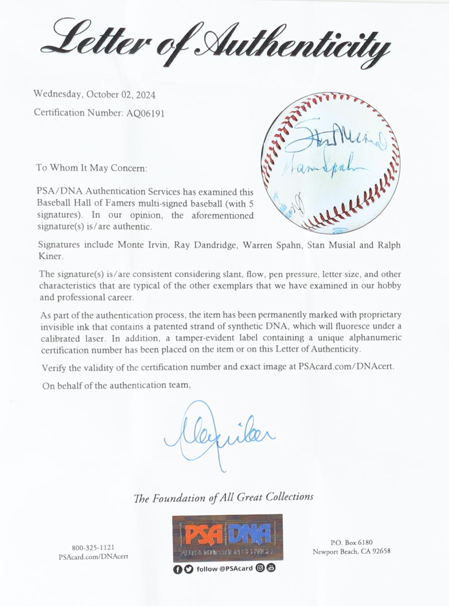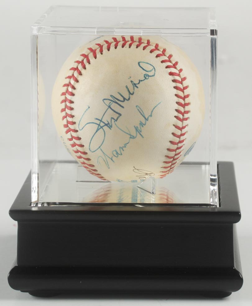 Rawlings Official American League baseball has been hand-signed by Ray Dandrige, Monte Irvin, Ralph Kiner, Stan Musial & Warren Spahn. Includes display case as shown. Please note, the baseball is naturally toned.
